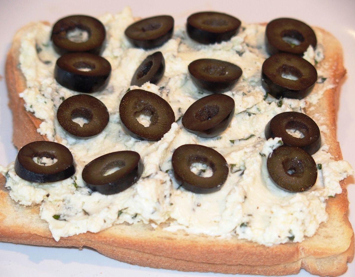 2) Montage : un toast tartiné avec le fromage de chèvre en couche épaisse, les olives en rondelles, un toast tartiné avec de la mayonnaise, la tranche de jambon cru, la salade, un toast tartiné de mayonnaise. Découpez le sandwich en 2 triangles et piquez-les avec un cure-dents.