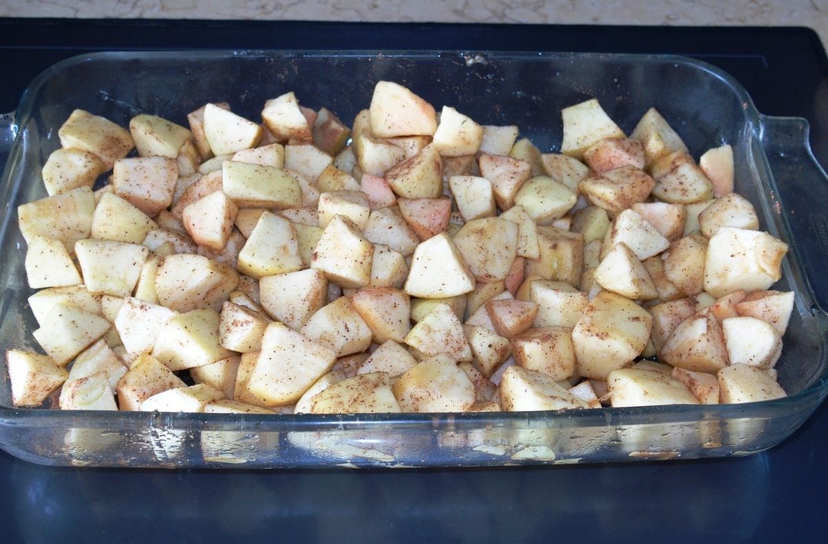 1) Beurrer un plat à gratin (j'ai utilisé un plat de 33 sur 21 cm et 5 cm de profondeur). Peler les pommes, évider le centre puis les couper en dés. Mettre dans le plat. Ajouter le jus de citron, 2 càs de poudre d'amandes, puis le miel en filet, saupoudrer de cannelle et d' 1 bonne càs de sucre. Bien mélanger directement dans le plat. Préchauffer le four à 180°C.