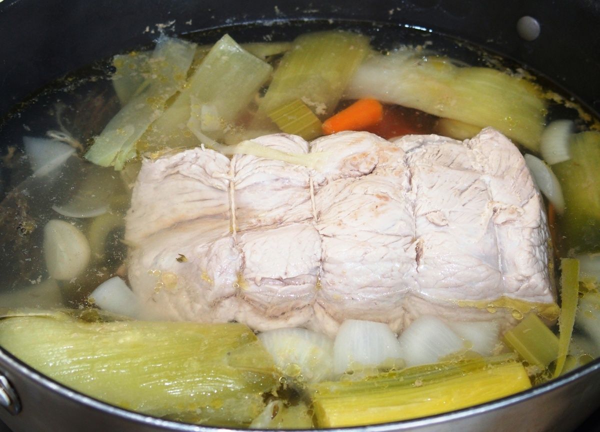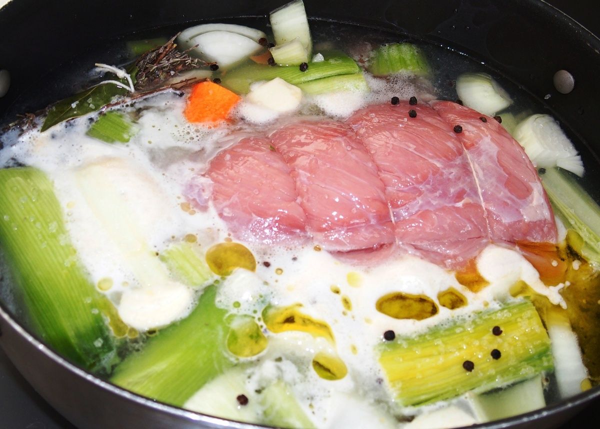 2) A l'ébullition, baisser le feu sur feu doux, couvrir avec un couvercle et cuire ainsi 50 minutes (retourner le veau après 25 minutes). Laisser refroidir le veau dans son bouillon, avec le couvercle de la cocotte durant toute la nuit ou au moins plusieurs heures.