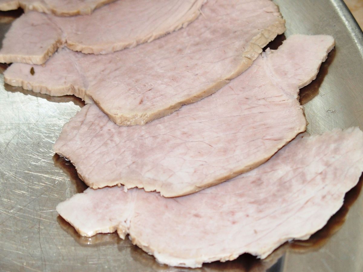 4) Couper le veau en tranches fines. L'idéal est d'utiliser une trancheuse. Sinon, le couper vraiment finement et disposer les tranches dans un plat, comme ça: