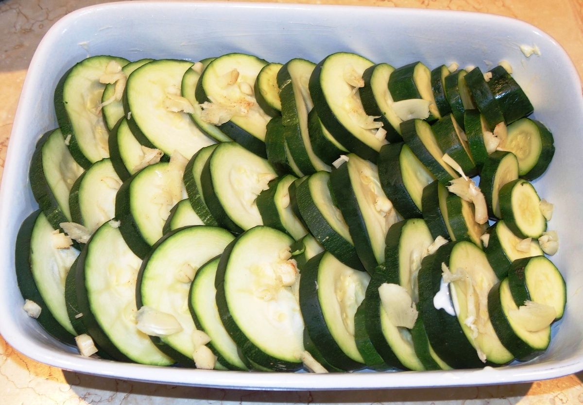 4) Beurrer un plat à gratin. Couper la gousse d'ail restante en deux et la frotter sur le fond et les bords du plat. Déposer les courgettes joliment, un peu en hauteur, comme sur la photo ci-dessous. Ecraser grossièrement les 5 gousses d'ail cuites à la vapeur et parsemer. Verser la liaison et saupoudrer le gratin de gruyère.