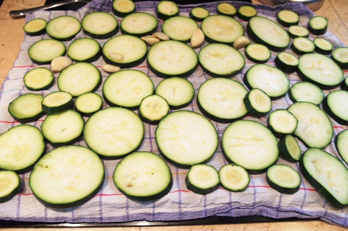 2) Déposer les rondelles sur un linge et les recouvrir d'un autre linge. Les laisser ainsi refroidir et sécher. Mettre les gousses d'ail de côté.