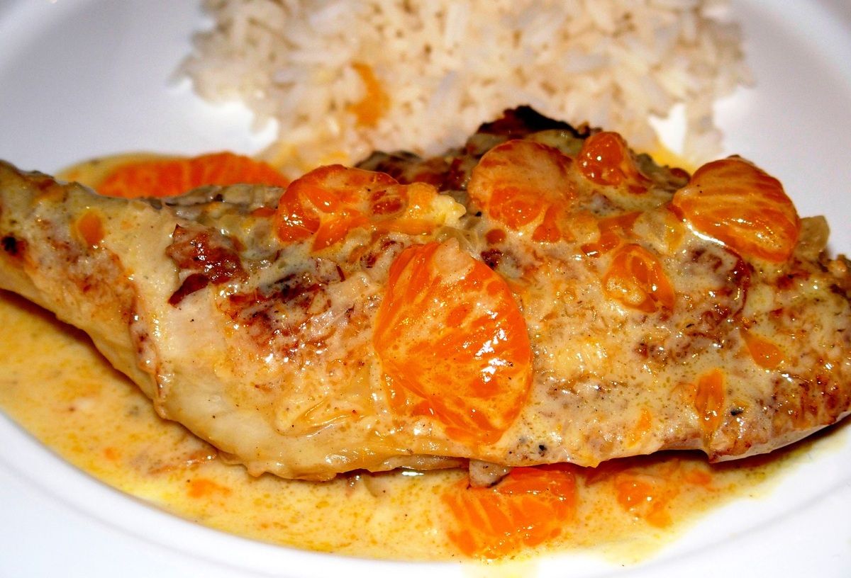 4) Diluer la fécule dans la crème froide et ajouter. Laisser cuire encore 5 minutes à découvert sur feu doux. Goûter et rectifier l'assaisonnement en sel et poivre. Tout à la fin, ajouter les quartiers de mandarines. Ne pas laisser cuire plus d'une minute à partir de ce moment-là, sinon les quartiers vont se défaire. Napper le poulet de sauce dans les assiettes et servir avec du riz.