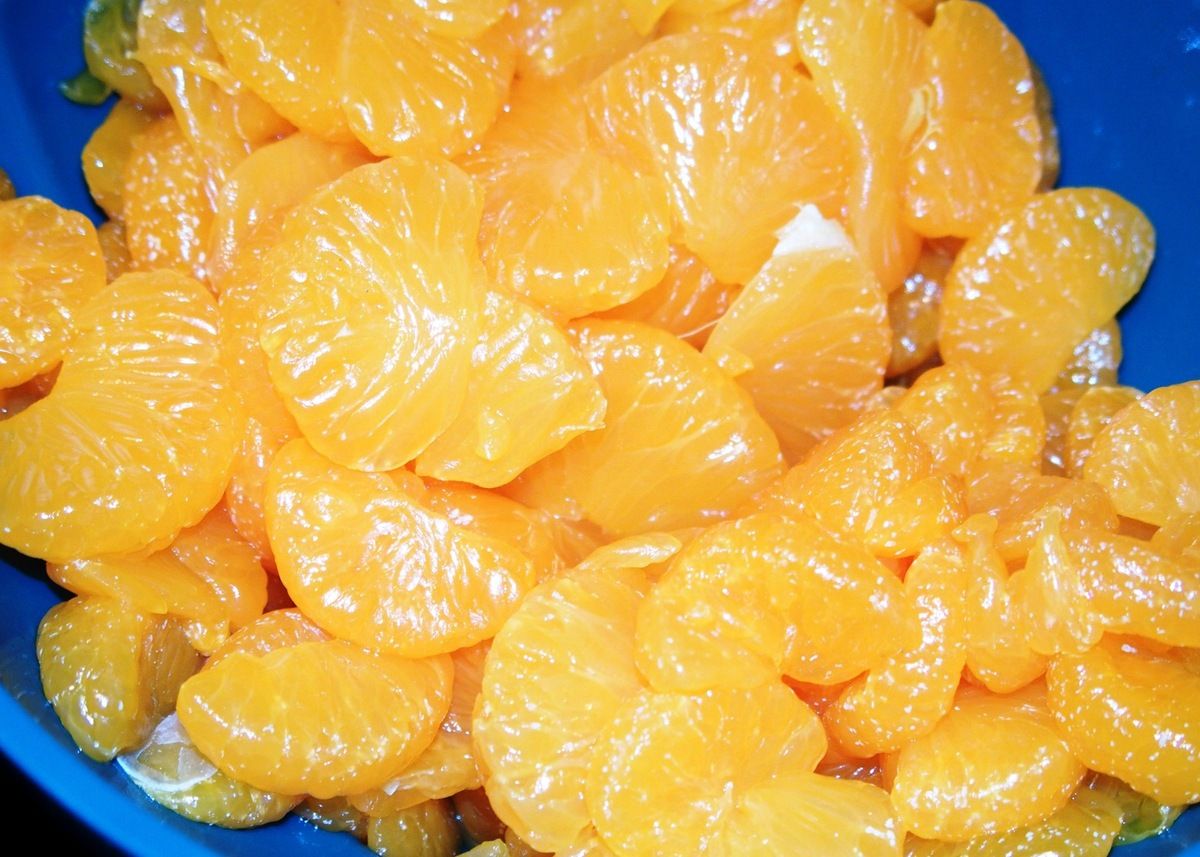 J'ai utilisé des quartiers de mandarines en boîte que j'ai trouvées à la COOP. Premièrement parce que ce n'est pas la saison et deuxièmement parce qu'il est TRES difficile de retirer les peaux des quartiers de mandarines fraîches. Par contre, les oranges et les citrons ont été choisis au rayon des fruits et légumes et pas au rayon des conserves.