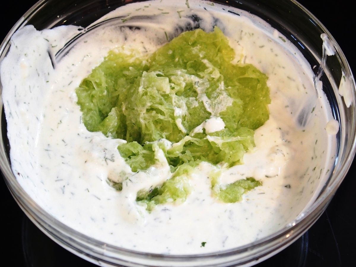 3) Dans la passoire, presser les concombres râpés plusieurs fois avec vos mains pour extraire le maximum d’eau. Ajouter les concombres dans la sauce au yaourt et mélanger soigneusement avec une fourchette. Mettre au frais plusieurs heures au moins avant de servir. Avec du pain, comme une salade ou en accompagnement d’une viande.