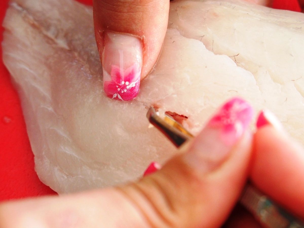 1) A l'aide d'une pince à épiler (et oui), enlever les quelques arêtes des filets en passant les doigts le long au centre pour les repérer.