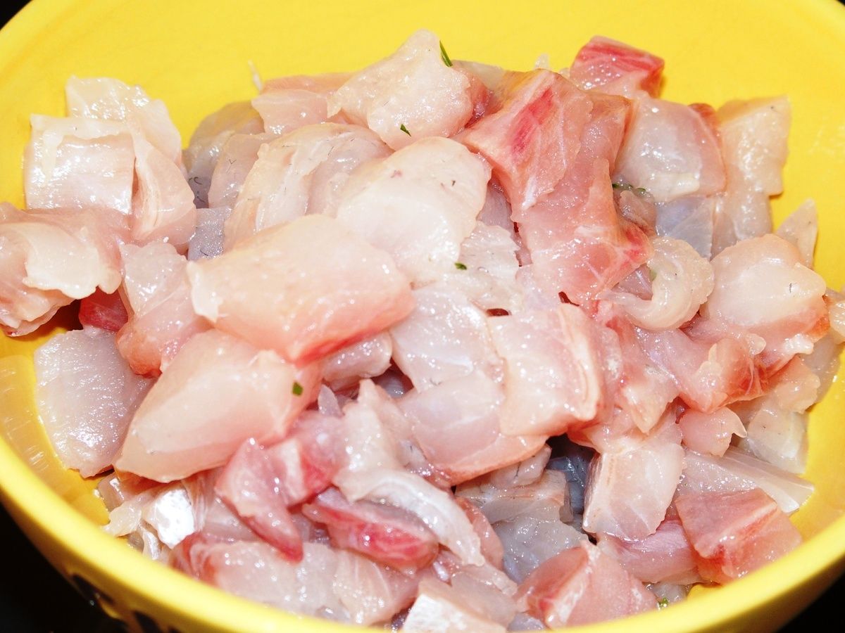 2) Enlever la peau s'il en reste avec un couteau fin. Couper les filets en petits dés. Mettre dans un récipient et placer au réfrigérateur.