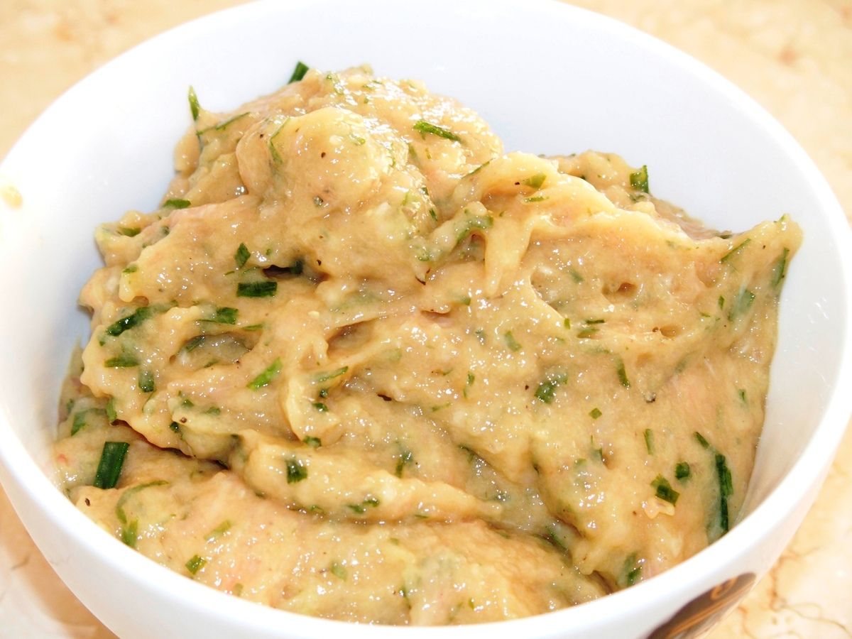 2) Préparer la farce: couper les viandes en petits morceaux et mettre dans un mixeur. Ajouter les oeufs, la ciboulette hachée, l'échalote hachée. Poivrer et saler (2 bonnes pincées). Mixer jusqu'à obtenir une pâte bien lisse.