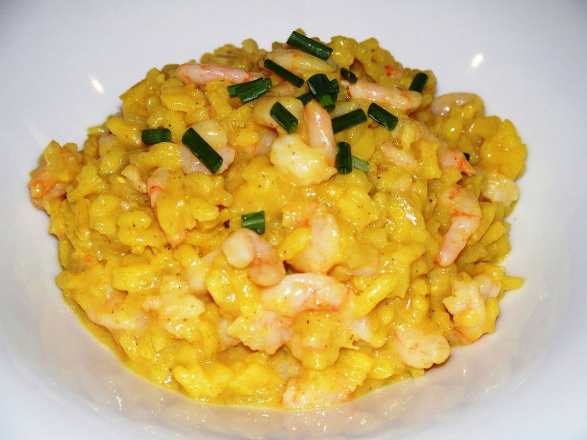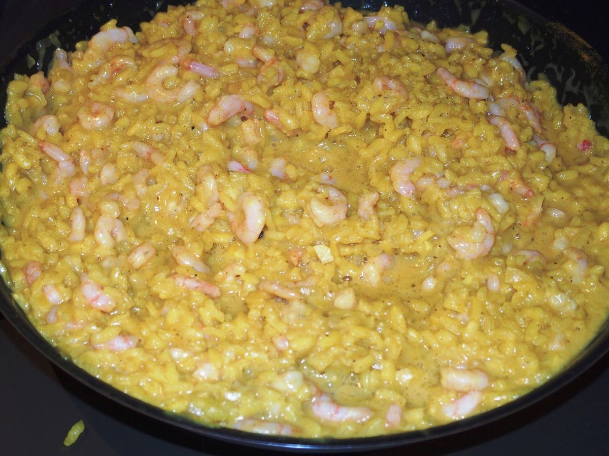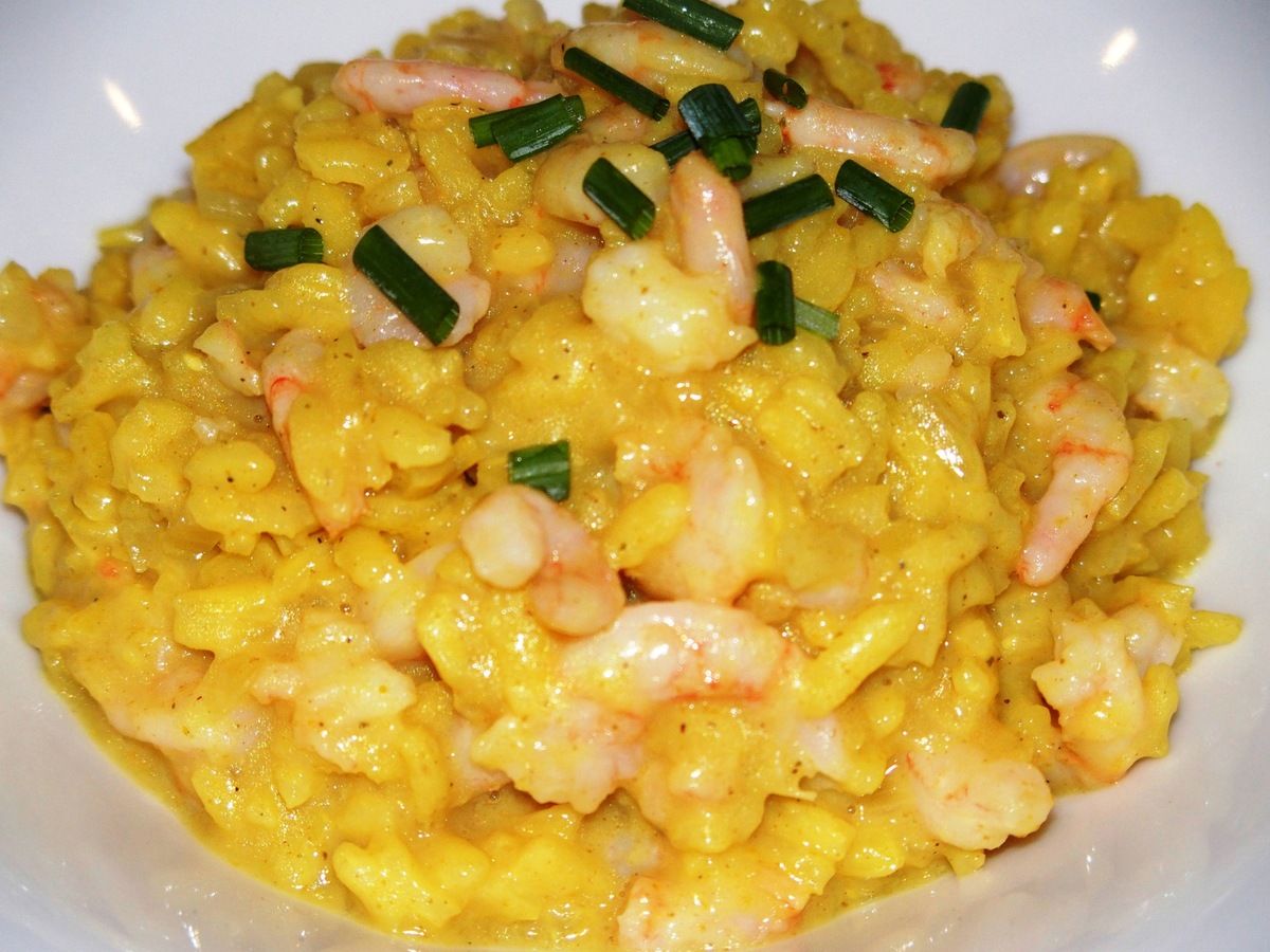 2) Lorsque le riz est presque cuit, ajouter les crevettes, le mascarpone et la crème. Bien mélanger pendant 2 à 3 minutes, goûter et rectifier l'assaisonnement, puis ôter la poêle du feu et couvrir. Le risotto doit rester un peu juteux, mais pas trop non plus. Il doit être... moelleux. Laisser ainsi reposer le risotto durant 3 à 5 minutes. Ciseler la ciboulette. Servir le risotto et parsemer de ciboulette. Proposer du parmesan râpé pour ceux qui le désirent...