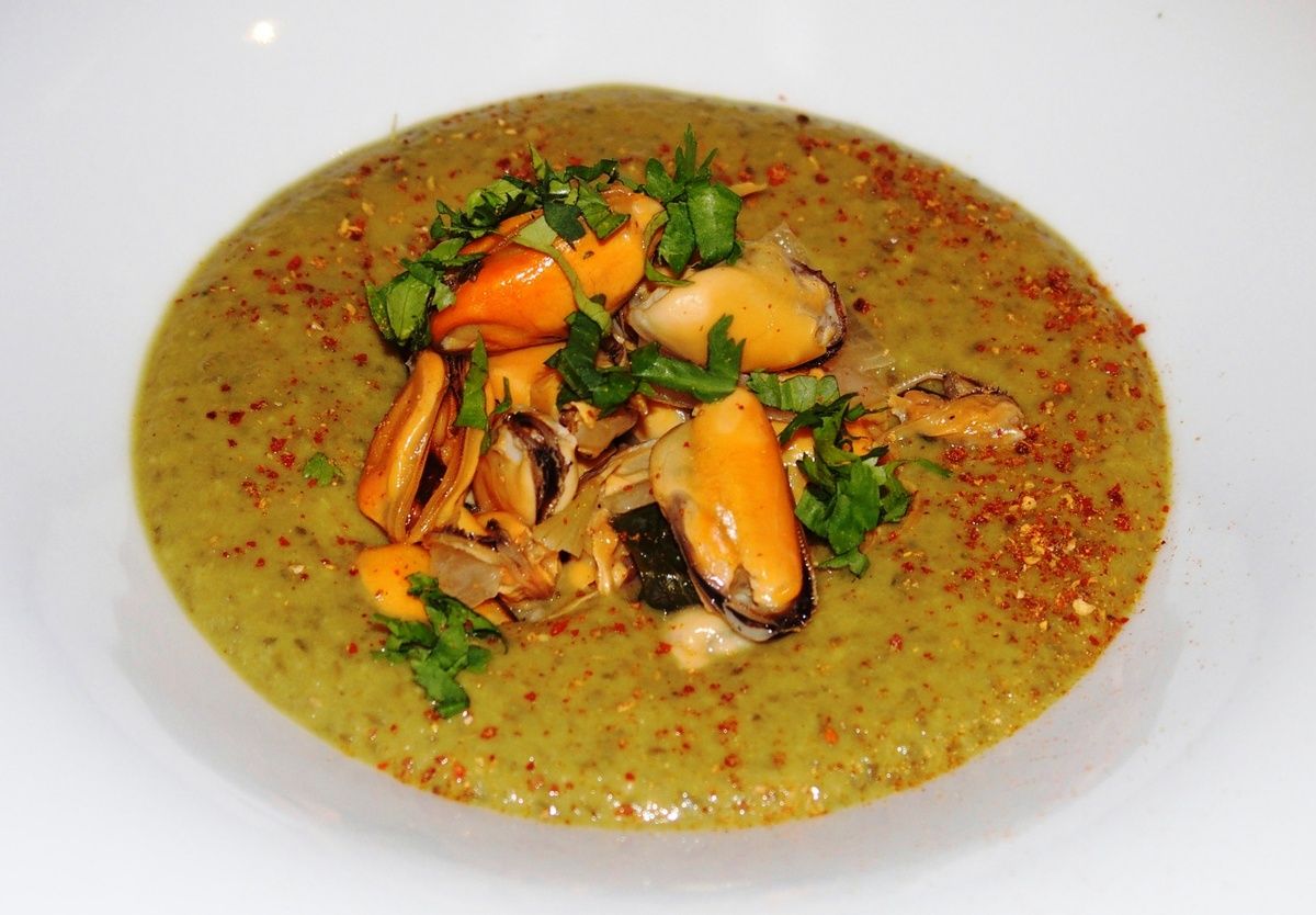 8) Verser le velouté dans des assiettes creuses, mettre les moules au centre et parsemer de piment d'Espelette et de coriandre ou de persil.