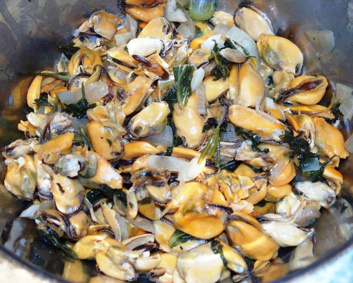 7) Pendant ce temps, réchauffer également les moules décortiquées en les versant dans la casserole avec le reste de jus.