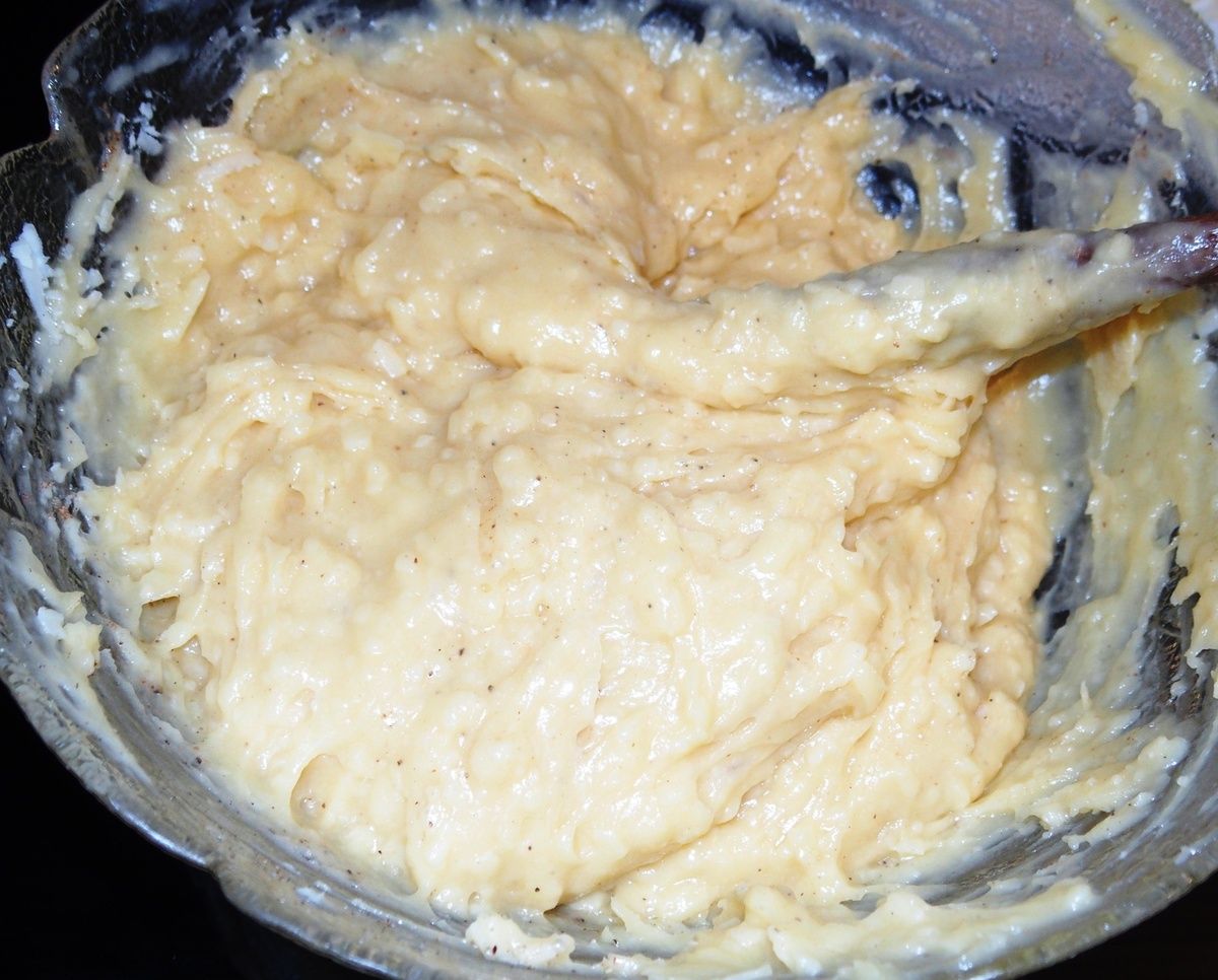 4) Ajouter le gruyère râpé. Mélanger. Poivrer et saupoudrer généreusement de noix de muscade. Mélanger.