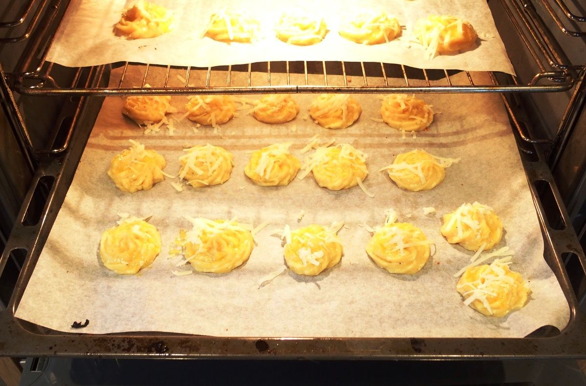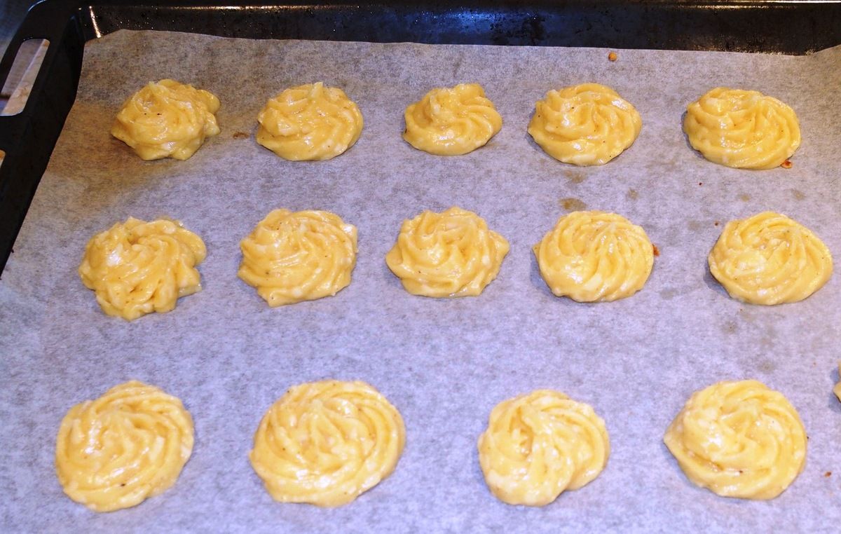 5) Préchauffer le four à 180°C. Là vous avez le choix: vous pouvez remplir une poche à douille et former des petits tas de la taille d'une noix sur une plaque recouverte de papier sulfurisé. Ou alors vous pouvez prendre 2 cuillères pour former les petits tas. Mais je trouve qu'avec la poche à douille, c'est bien pratique! Faites attention à laisser assez d'espace entre les gougères. D'ailleurs, pas besoin de leur donner une jolie forme, elles vont gonfler. Pour cette quantité, j'ai utilisé deux plaques que j'ai fait cuire en même temps dans le four. Dorer les gougères avec l'oeuf et parsemer de gruyère. Enfourner pour environ 25 à 30 minutes, jusqu'à ce qu'elles soient bien dorées.