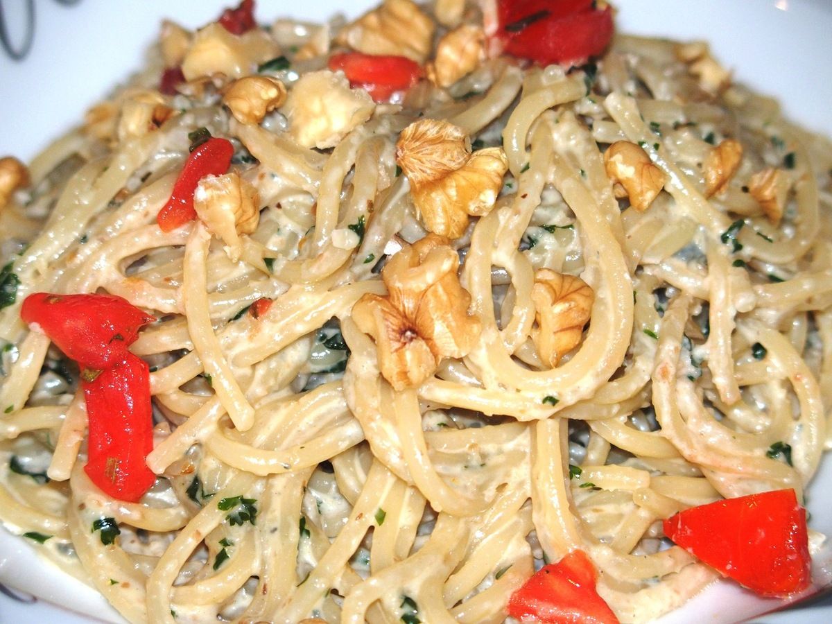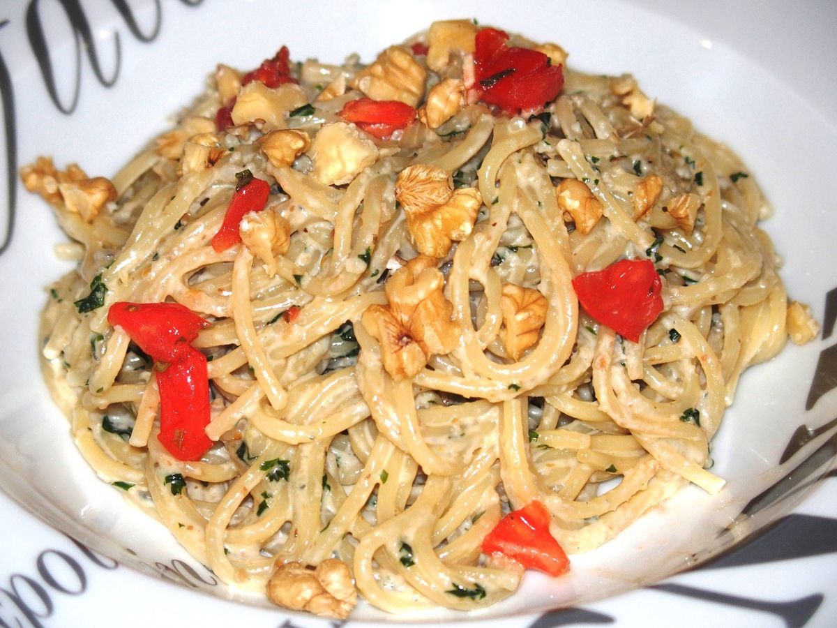 Une sauce au Gorgonzola, noix, crème, persil... servie avec des spaghettis al dente, que demande le peuple? Une partie des noix est réduite en poudre et ajoutée à la sauce, ce qui donne une texture onctueuse et un bon petit goût subtil.