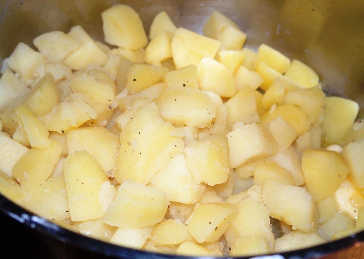 1) Préparer la purée: éplucher les pommes-de-terre. Entières, les passer sous l'eau froide. Les couper en morceaux de la taille d'un gros dé. Les mettre dans une grande casserole. Recouvrir d'eau. Ajouter 1 bonne càc de sel, 1 càc de muscade moulue et quelques tours de moulin à poivre. Porter à ébullition. A l'ébullition, baisser sur feu moyen et laisser cuire ainsi 20 à 25 minutes jusqu'à ce que les pommes-de-terre soient fondantes.