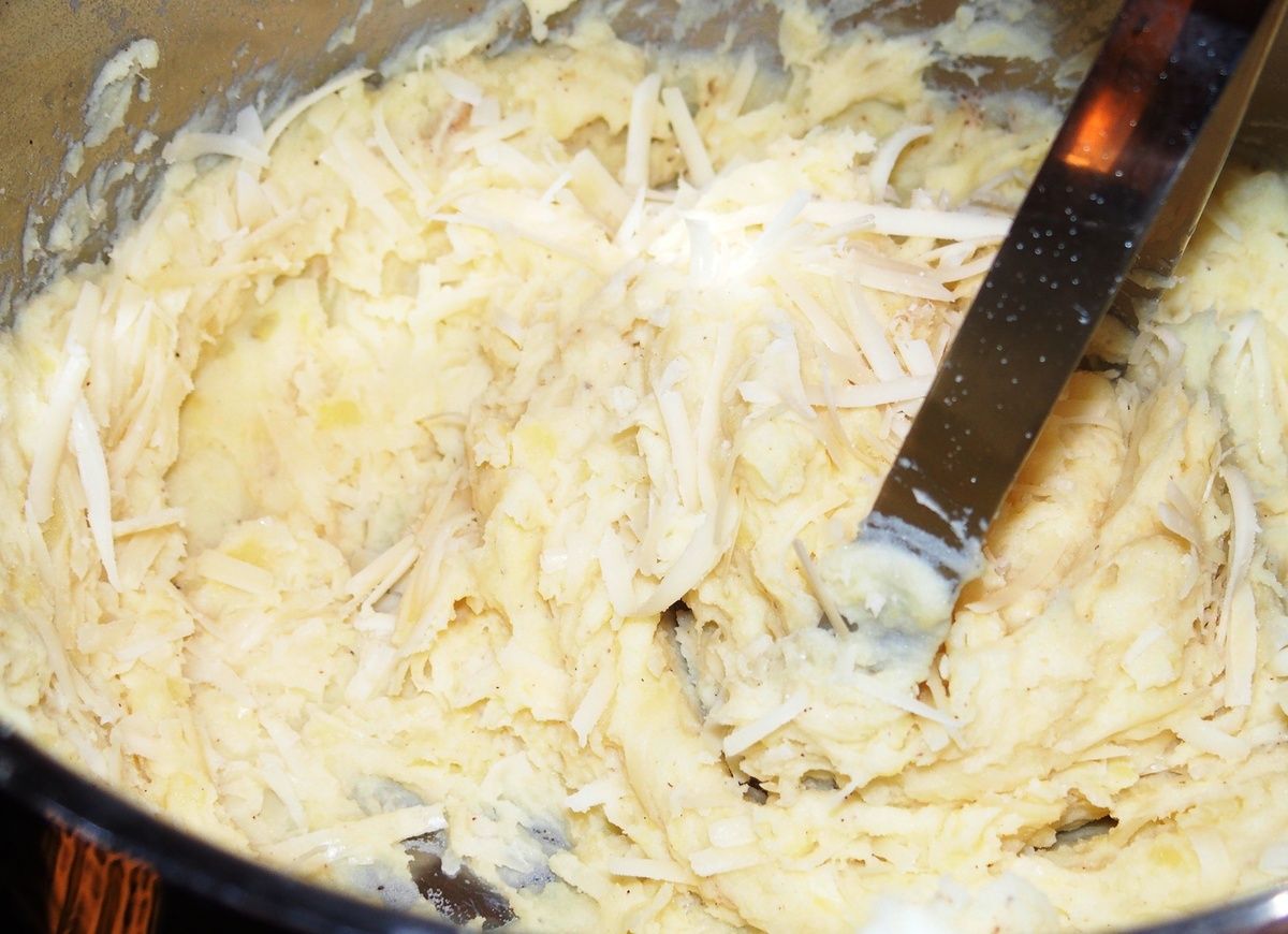 4) Préchauffer le four en position gril à 210°C. Préparer la purée: lorsque les pommes-de-terre sont fondantes, les égoutter puis les remettre dans la casserole. Ajouter les 50g de beurre et le lait. Poivrer. Ecraser la purée à l'aide d'un presse-purée. Elle doit rester ferme, mais aussi moelleuse. Ajouter la moitié du gruyère, soit 50g et mélanger. Goûter et rectifier l'assaisonnement en sel si besoin.