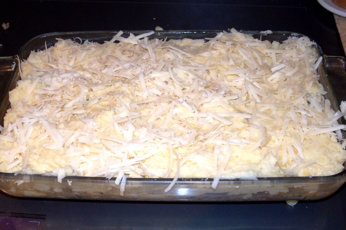 Une couche de purée, une couche de farce, une couche de purée pour l’esthétique au moment du service.<br /> Chapelure et fromage sur le dessus pour une bonne consistance et un beau gratiné.