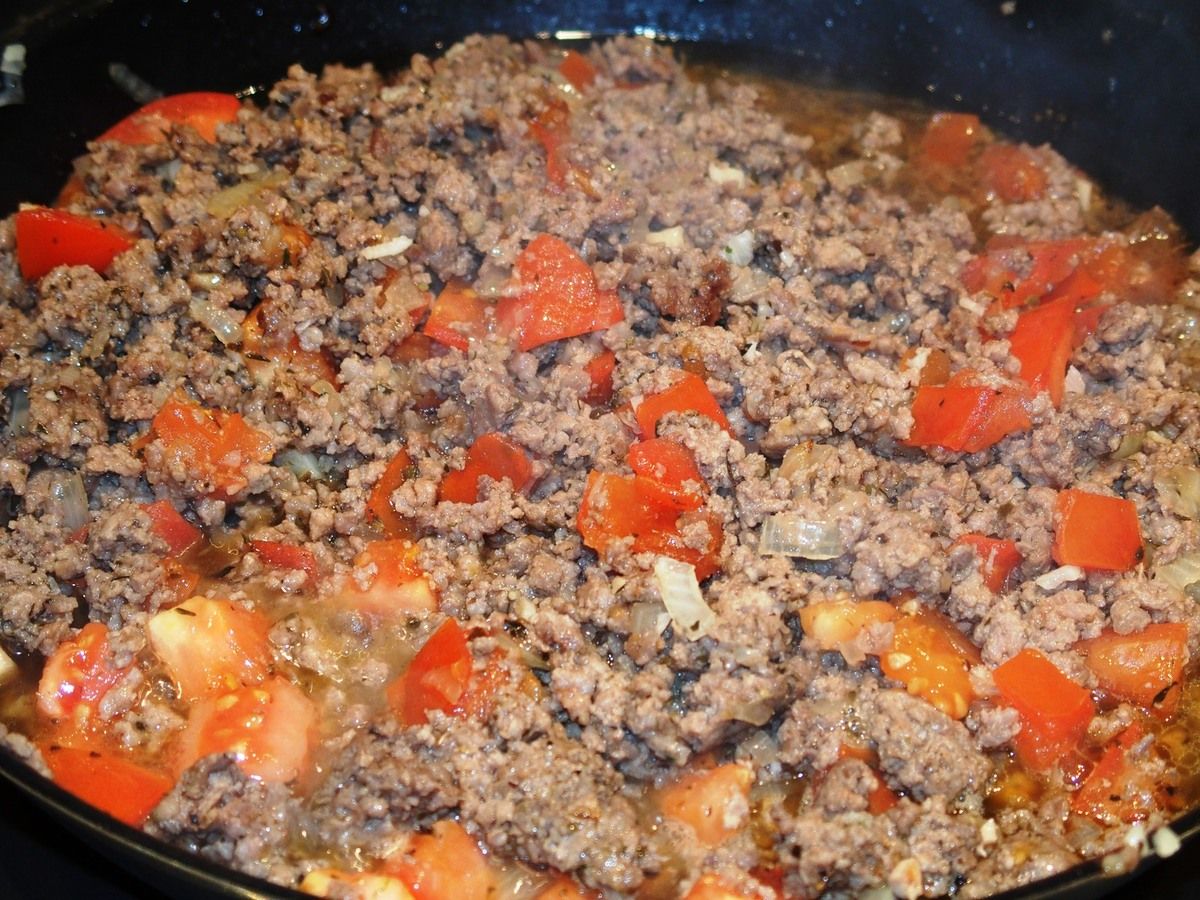 2) Pendant ce temps, hacher l'ail et l'oignon finement. Réserver. Couper les tomates en dés et réserver. Hacher le persil et réserver également. Râper le gruyère et réserver. Dans une poêle, faire revenir à feu vif la viande hachée dans un bon filet d'huile à rôtir. Lorsqu'elle est dorée, après quelques minutes, baisser sur feu moyen puis ajouter l'ail et l'oignon et faire revenir 2 minutes. Poivrer, saupoudrer d'herbes de Provence et ajouter le cube de bouillon émietté. Ajouter les dés de tomates. Faire revenir en mélangeant 5 minutes.