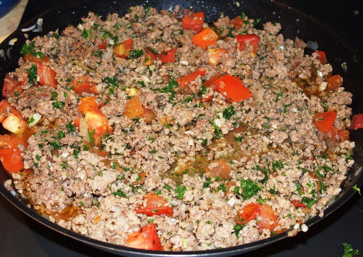 3) Ajouter environ 1,5 dl d'eau dans la poêle. Ajouter le persil. Faire cuire encore environ 5 minutes. Le hachis doit rester un peu liquide (mais pas trop non plus). Sinon il sera trop sec à la dégustation. Goûter et rectifier l'assaisonnement. Sortir la poêle du feu et laisser tiédir. Mélanger les oeufs entiers dans un verre avec une fourchette et ajouter dans la poêle. Mélanger et réserver.