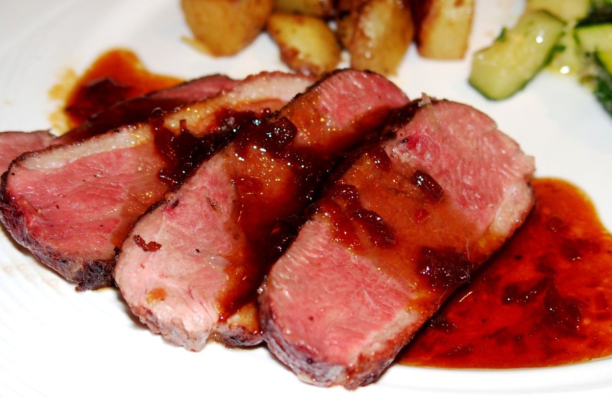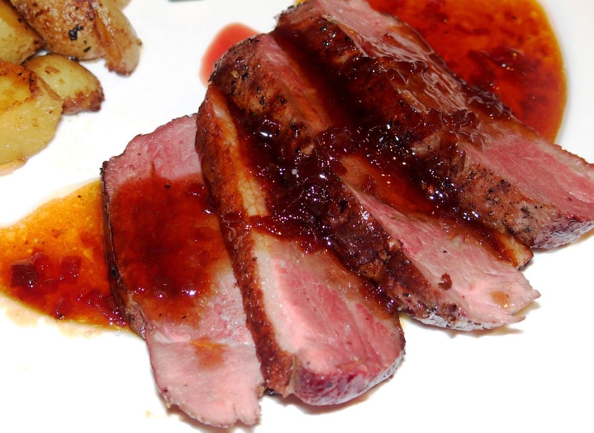 5) Sortir les magrets de canard du four et les découper en jolies tranches. Napper avec la sauce au vinaigre de framboise. Régalez-vous!