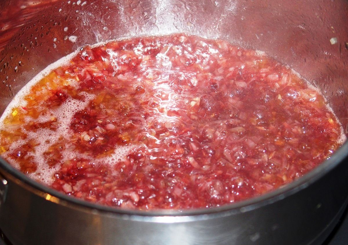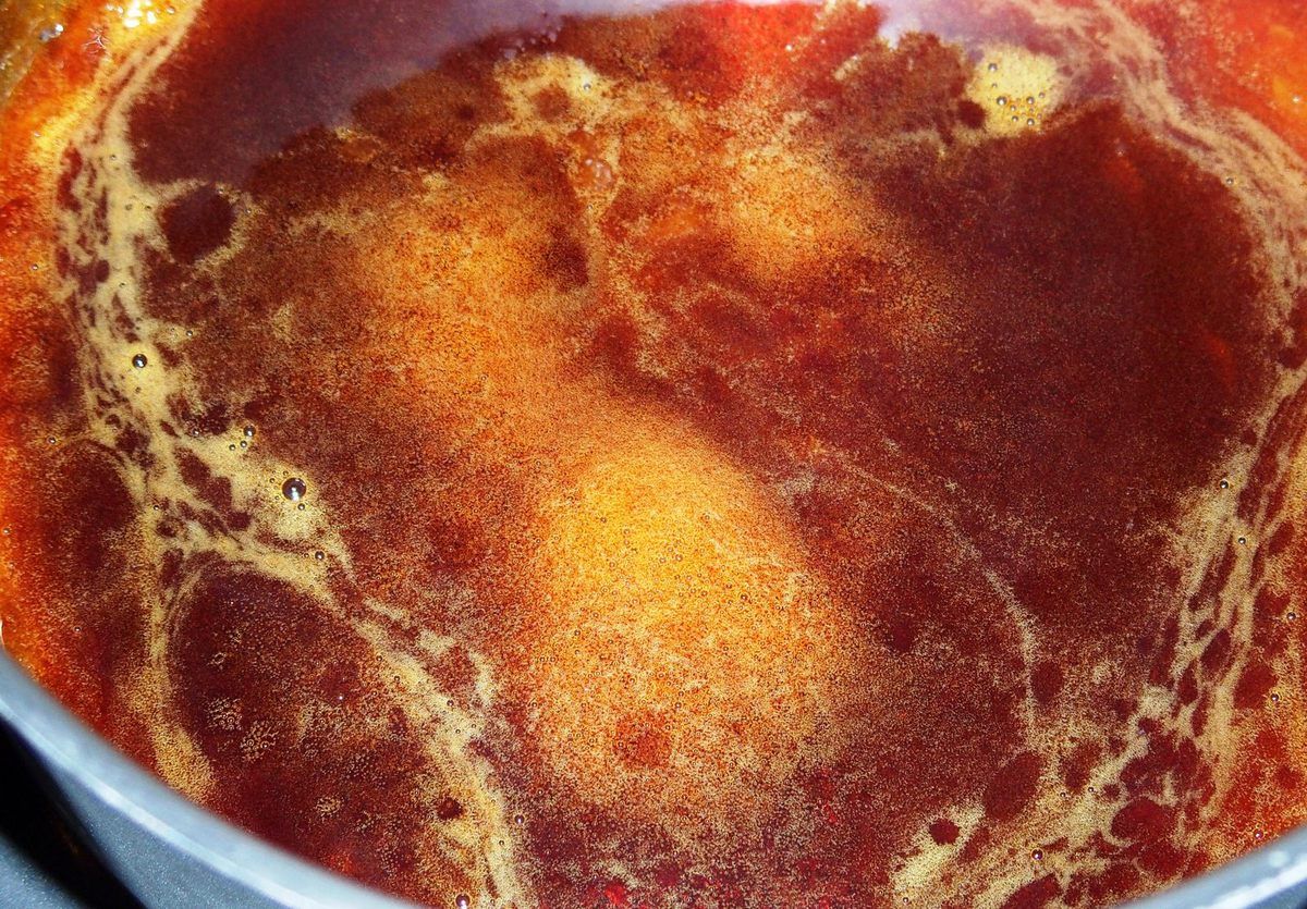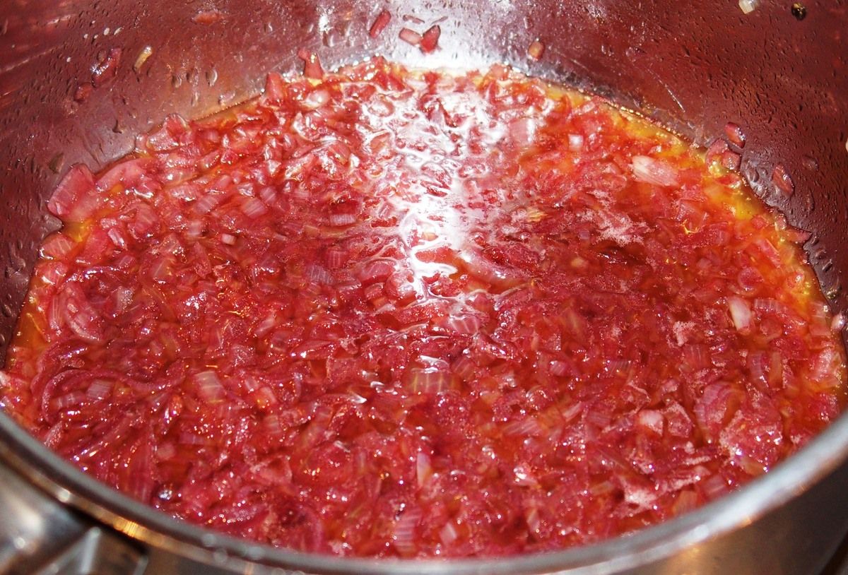 3) Pendant que le sucre caramélise, dans la deuxième casserole, faire revenir les échalotes dans un filet d'huile d'olive durant 2 minutes sur feu moyen. Ajouter le vin rouge. Laisser réduire de moitié durant 3 à 4 minutes.