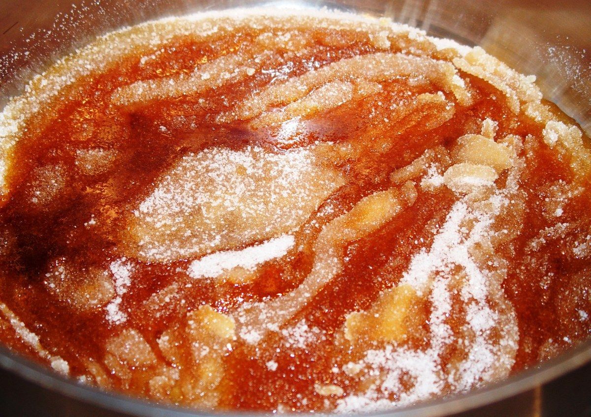 2) Pendant que les magrets cuisent tranquillement, occupons-nous de la sauce. Hacher finement les échalotes. Préparer 2 casseroles. Dans la première, mettre le sucre (secouer la casserole de façon à ce que le sucre soit bien "à plat" partout). Sur feu moyen, faire fondre le sucre pour obtenir un caramel. Ne pas mélanger, laisser le sucre se caraméliser gentiment en bougeant de temps en temps la casserole d'avant en arrière. Pour obtenir un beau caramel, cela prendra environ 10 minutes.