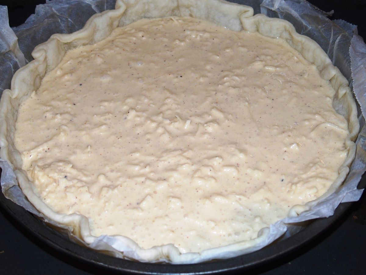 4) Sortir le moule à tarte du four après 7 minutes. Baisser la température à 200°C. Verser la liaison et enfourner pour environ 30 minutes, toujours en bas du four, sur la grille. Si la tarte colore trop à votre goût, la recouvrir d'une feuille de papier aluminium en fin de cuisson. Servir avec une salade verte!