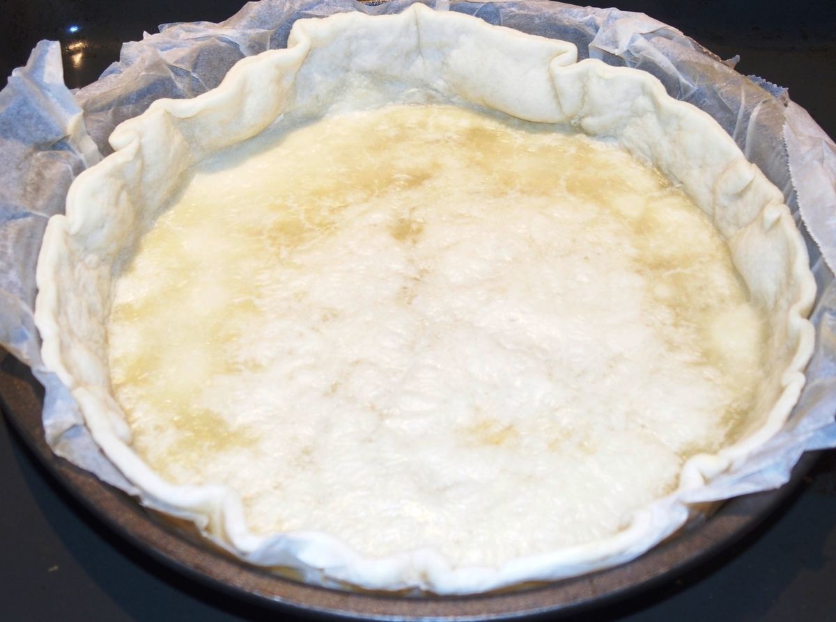 2) Foncer le moule à tarte avec la pâte abaissée. Moi, je laisse le papier sulfurisé. Sinon, beurrer et fariner le moule à tarte avant d'y déposer la pâte. Bien appuyer sur la pâte sur tout le tour du moule afin qu'elle adhère bien. La coller presque contre les bords (sinon elle va se rétracter et retomber dans le moule). Ainsi que sur le contour du fond qui fait angle droit avec les bords. Piquer avec une fourchette le fond. Dans un grand récipient, casser les oeufs. Tremper un pinceau à pâtisserie uniquement dans le blanc et badigeonner le fond de la tarte au pinceau avec le blanc (l'équivalent d'une cuillère à soupe).  Enfourner dans le bas du four préchauffé à 220°C sur la grille pour 7 minutes. Si la pâte lève en cours de cuisson, ouvrez la porte du four et piquez avec une fourchette. Non mais, on va pas se laisser faire...