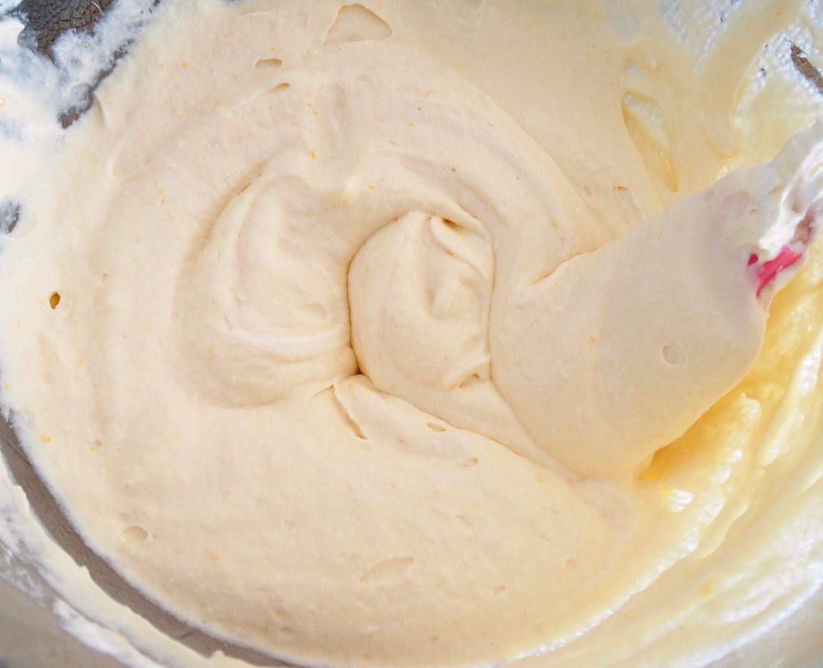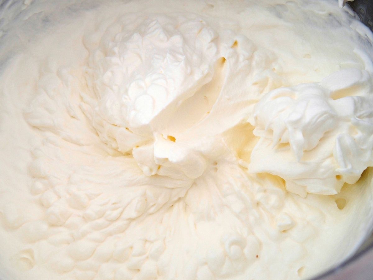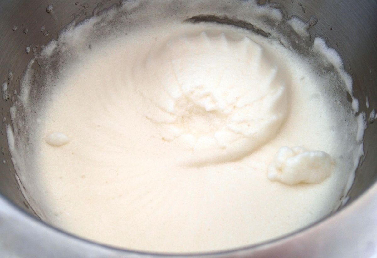 4) Monter la crème bien froide avec une pincée de sel en chantilly dans un récipient, à l’aide d’un batteur. L'incorporer tout aussi délicatement à la masse avec la spatule.
