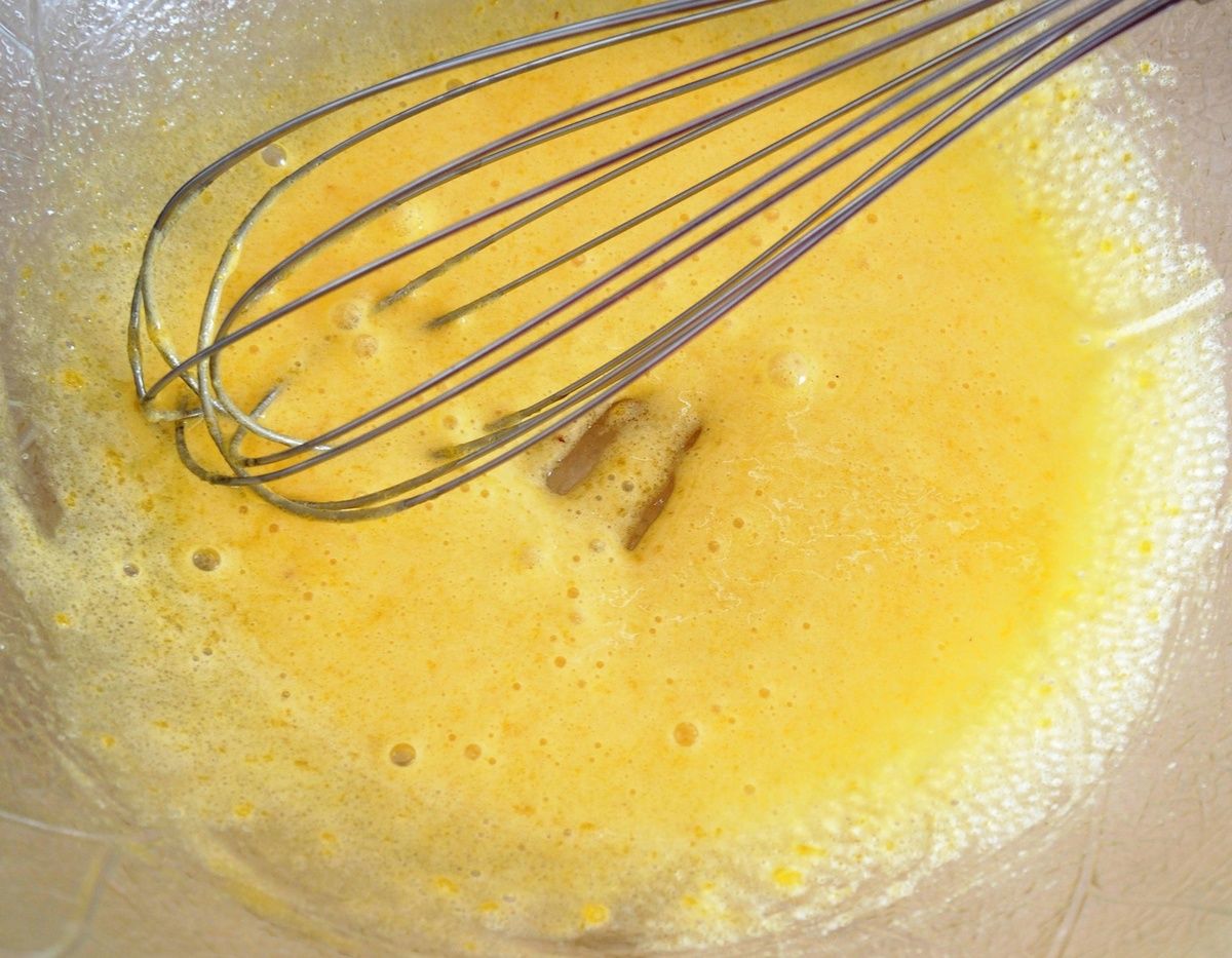 3) Dans le récipient contenant les jaunes, ajouter 50g de sucre et mélanger au fouet. Ajouter les blancs d’œufs petit à petit et mélanger à l’aide d’une spatule délicatement afin de ne pas casser les blancs.