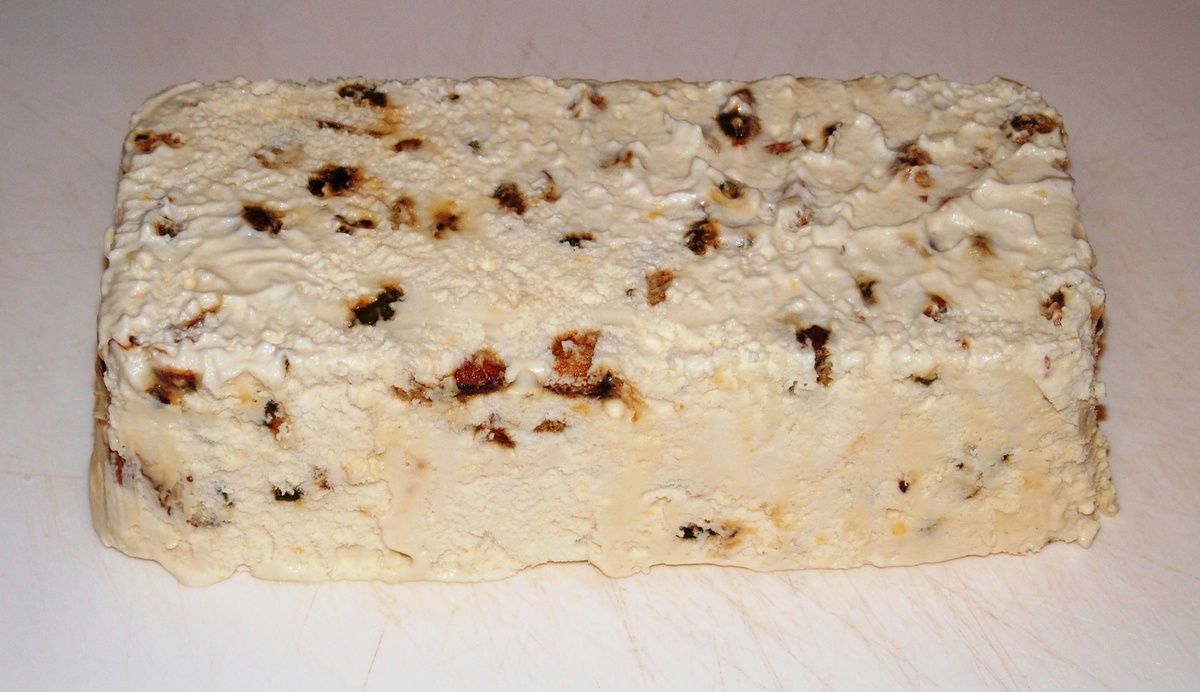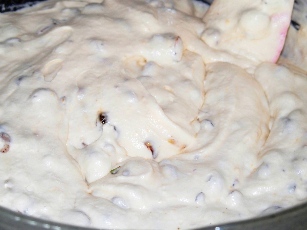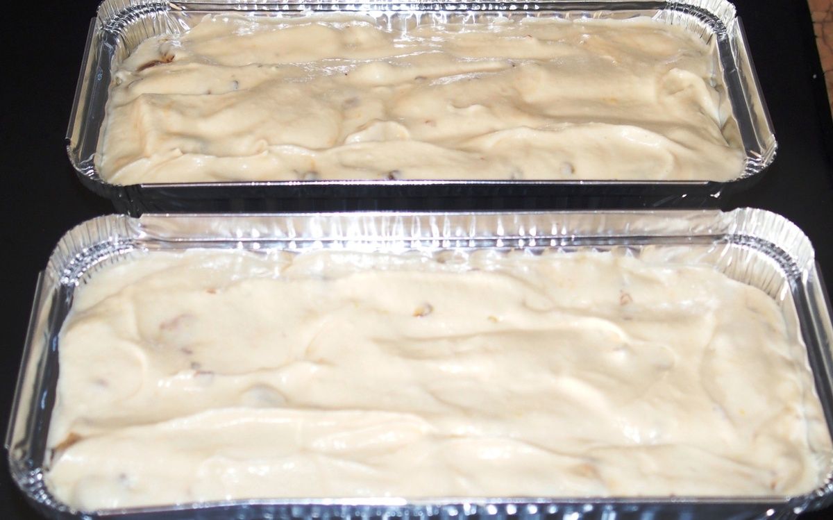 5) Ajouter les amandes, noisettes et pistaches concassées. Mélanger une dernière fois. Verser la masse dans des bacs en alu jetables ou dans un moule à cake chemisé de papier film. Recouvrir de papier film et placer au congélateur pour 24 heures.