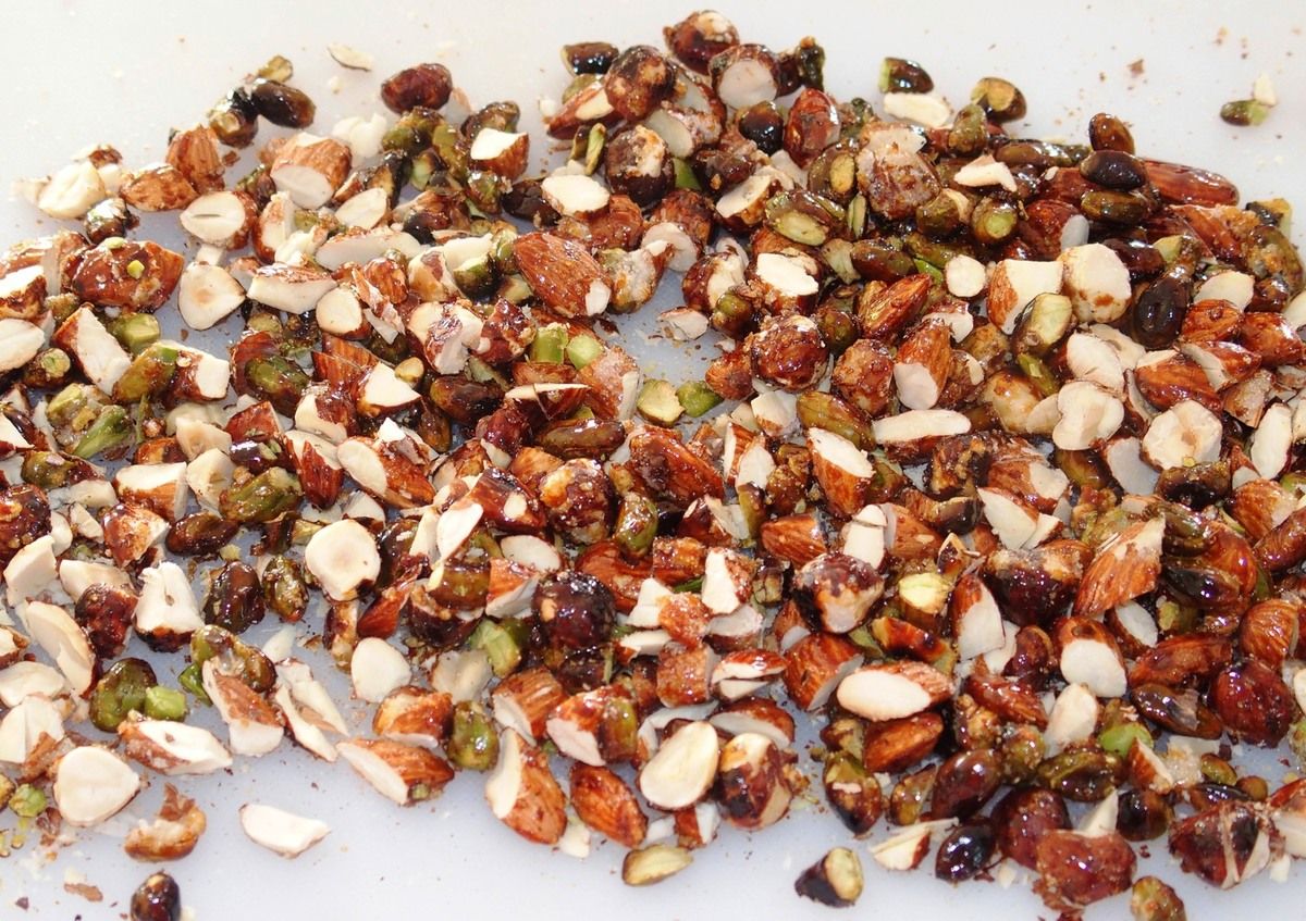 1) Dans une poêle, verser les amandes, les noisettes et les pistaches. Saupoudrer de 50g de sucre. Sur feu moyen, faire caraméliser durant une dizaine de minutes en mélangeant souvent. Réserver et laisser tiédir sur une planche. Concasser finement à l’aide d’un grand couteau les noisettes, les amandes et les pistaches.