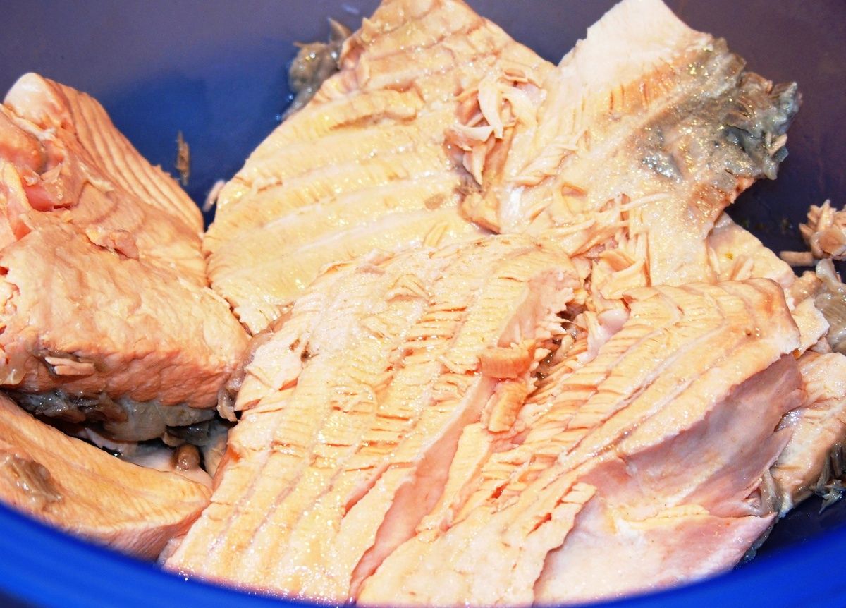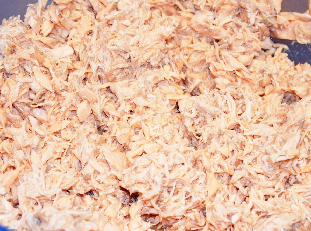 3) Lorsque le saumon est froid, retirer la peau s'il y en a. Puis effilocher les filets finement à l'aide de deux fourchettes. Ajouter le yaourt et le Philadelphia. Mélanger. Ciseler l'aneth finement et ajouter. Couper le saumon fumé en fines lanières et ajouter également.