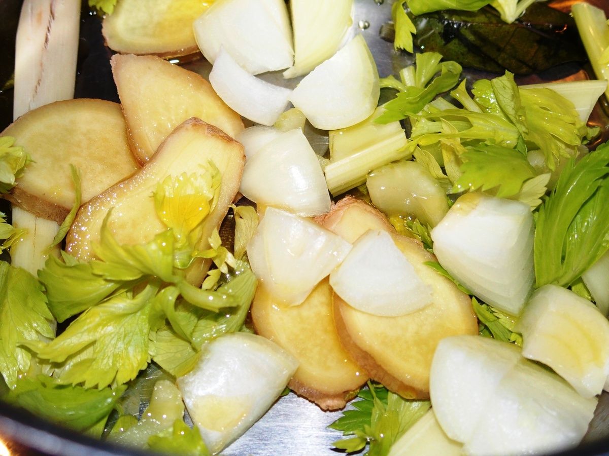 1) Dans une casserole, mettre le gingembre coupé en gros morceaux (pas besoin de le peler). Ecraser un peu la tige de citronnelle avec le plat d'un couteau sur une planche et ajouter. Peler et couper grossièrement l'oignon. Ajouter dans la casserole. Couper la branche de céleri en morceaux et ajouter. Mettre un filet d'huile d'olive dans la casserole et faire revenir le tout à feu moyen-vif 2 minutes.