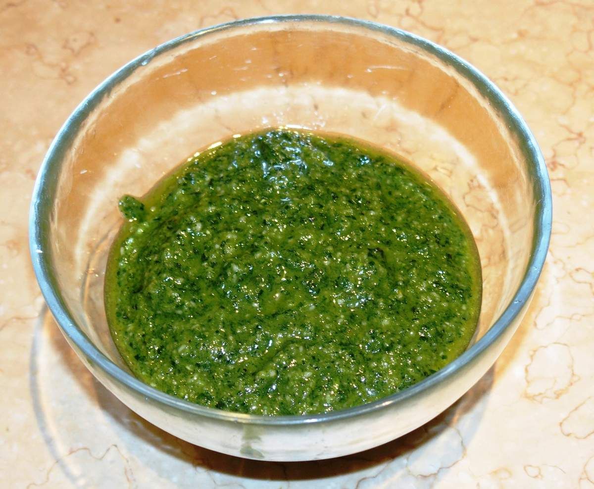 2) Préparer le pesto: dans un récipient, mettre le persil et le basilic grossièrement hachés, les pignons, la gousse d'ail pelée et coupée en morceaux et l'huile d'olive. Mixer avec un plongeur. Poivrer et saler. Goûter et rectifier l'assaisonnement. Réserver dans un bol.