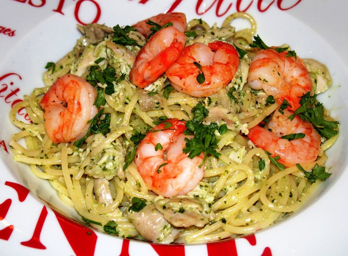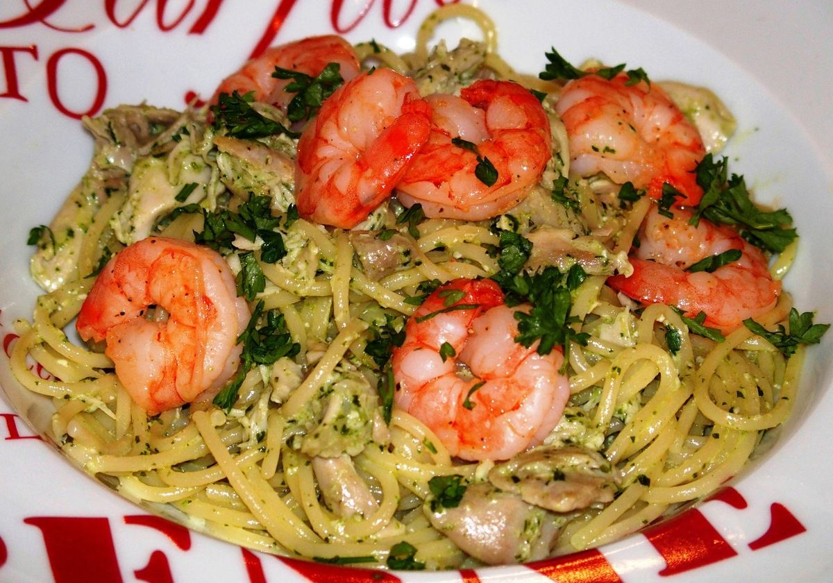 7) Mélanger les pâtes cuites al dente avec la sauce. Mettre dans des assiettes creuses et disposer quelques crevettes au-dessus avec un peu de persil haché et proposer un peu de parmesan frais râpé à côté.
