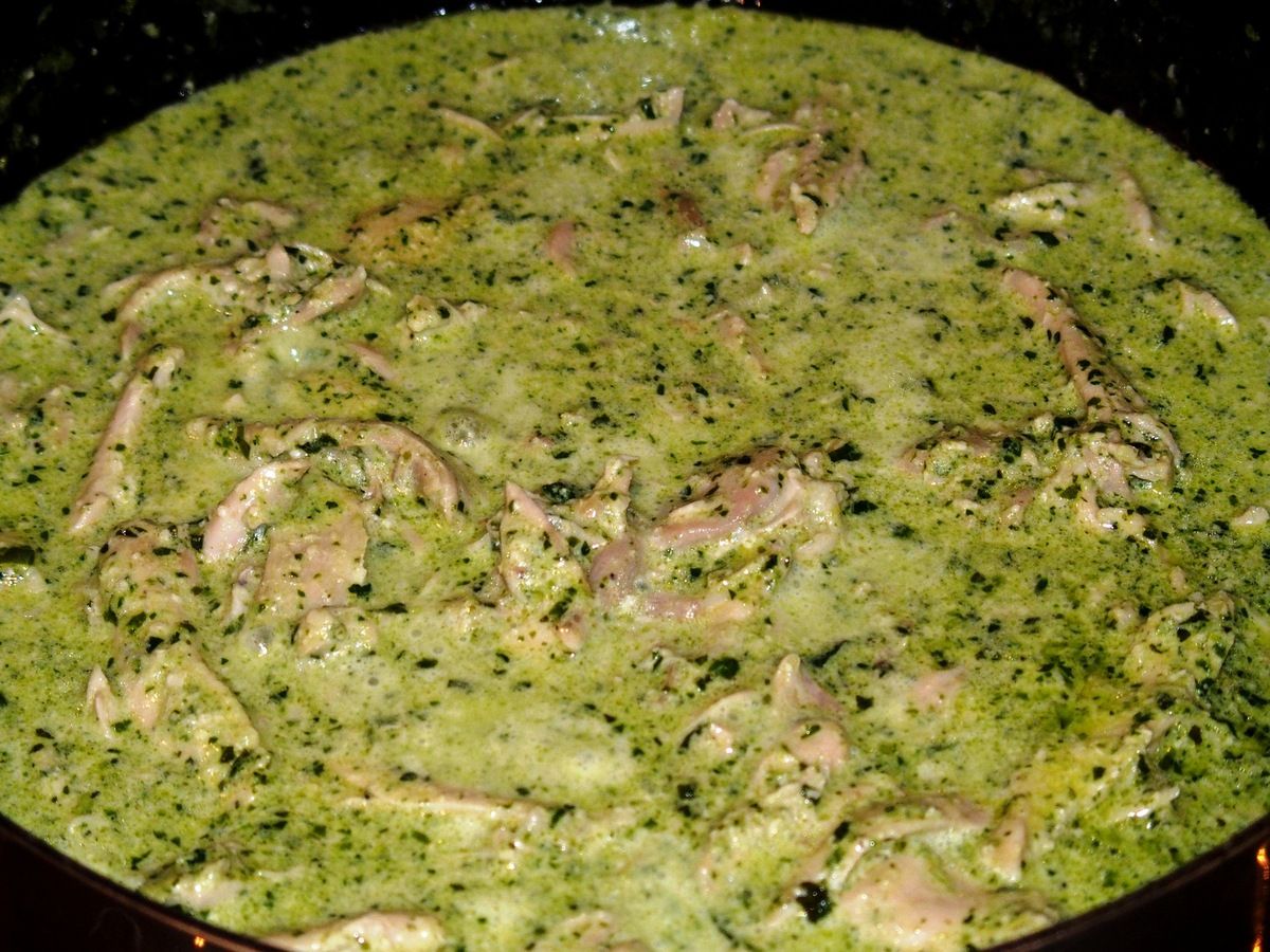4) Dans une poêle haute, saisir les morceaux de poulet dans un filet d'huile à rôtir, 3 minutes s'il est déjà cuit, 5 à 6 minutes s'il est cru (jusqu'à ce qu'il soit doré). Ajouter le pesto et mélanger. Ajouter 2,5 dl du bouillon réservé ou 2,5 dl d'eau avec 1/2 cube de bouillon de volaille. Laisser mijoter à feu doux environ 10 minutes.