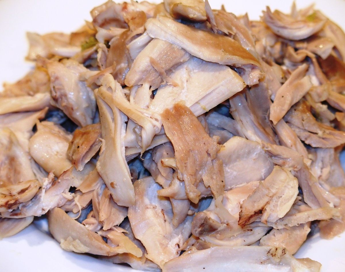 3) Effilocher les cuisses de poulet en enlevant la peau. Filtrer 2,5 dl du bouillon qui aura servi à cuire les cuisses. Si vous utilisé du blanc de poulet, le couper en lanières.