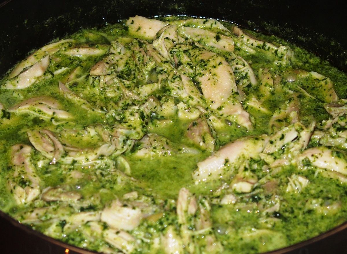 J'ai cuit mon poulet au bouillon. J'avais acheté 6 cuisses au total. La chair est beaucoup plus tendre et goûtue que le filet et la préparation est simple comme bonjour. Après avoir cuit les cuisses durant 1 heure (vous pouvez le faire la veille), je les ai effilochées en retirant la peau. Vous pouvez aussi utiliser les restes de votre poulet rôti, cela va très bien. Et sinon, utilisez du blanc (450g environ) que vous couperez en lanières. En cuisant les cuisses au bouillon, j'en ai utilisé une partie (du bouillon donc) pour ma sauce.