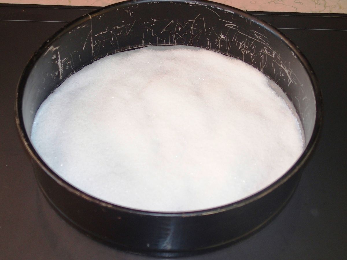 1) Préchauffer le four à 220°C. Sur une feuille de papier sulfurisé, poser le moule et tracer le contour du fond avec un crayon. Découper le cercle et le placer dans le fond du moule. Mettre 200g de sucre sur le papier en le répartissant bien. Taper un peu le moule sur le plan de travail pour que la répartition soit homogène. Enfourner dans le bas du four pour environ 15 minutes, le temps que tout le sucre fonde bien et prenne une belle couleur. Sortir le moule du four et baisser la température à 180°C. Couper quelques fines lamelles de beurre et les répartir sur le caramel.