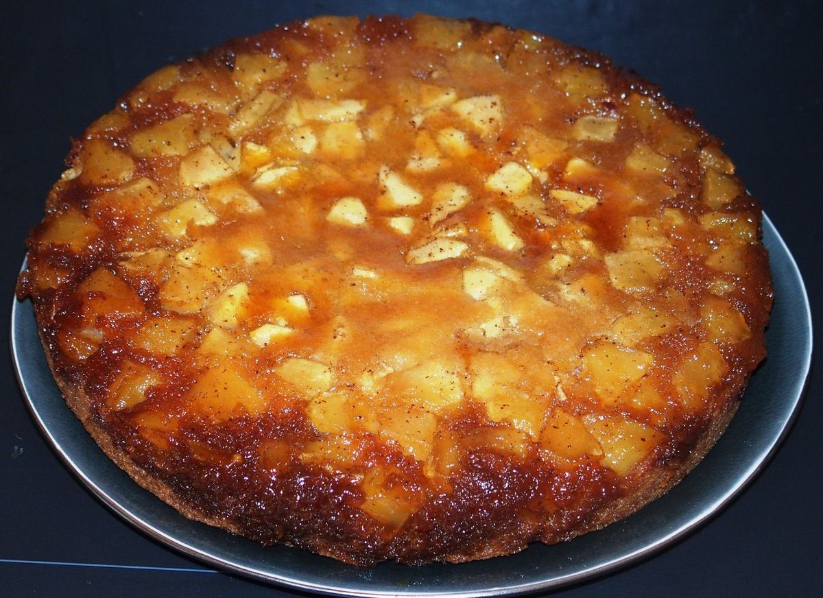 J'ai réalisé un caramel dans le fond du moule à manqué, puis j'ai disposé des morceaux de pommes dessus que j'ai recouverts avec la liaison quatre-quarts. A déguster tiède ou bien frais! Sublime!