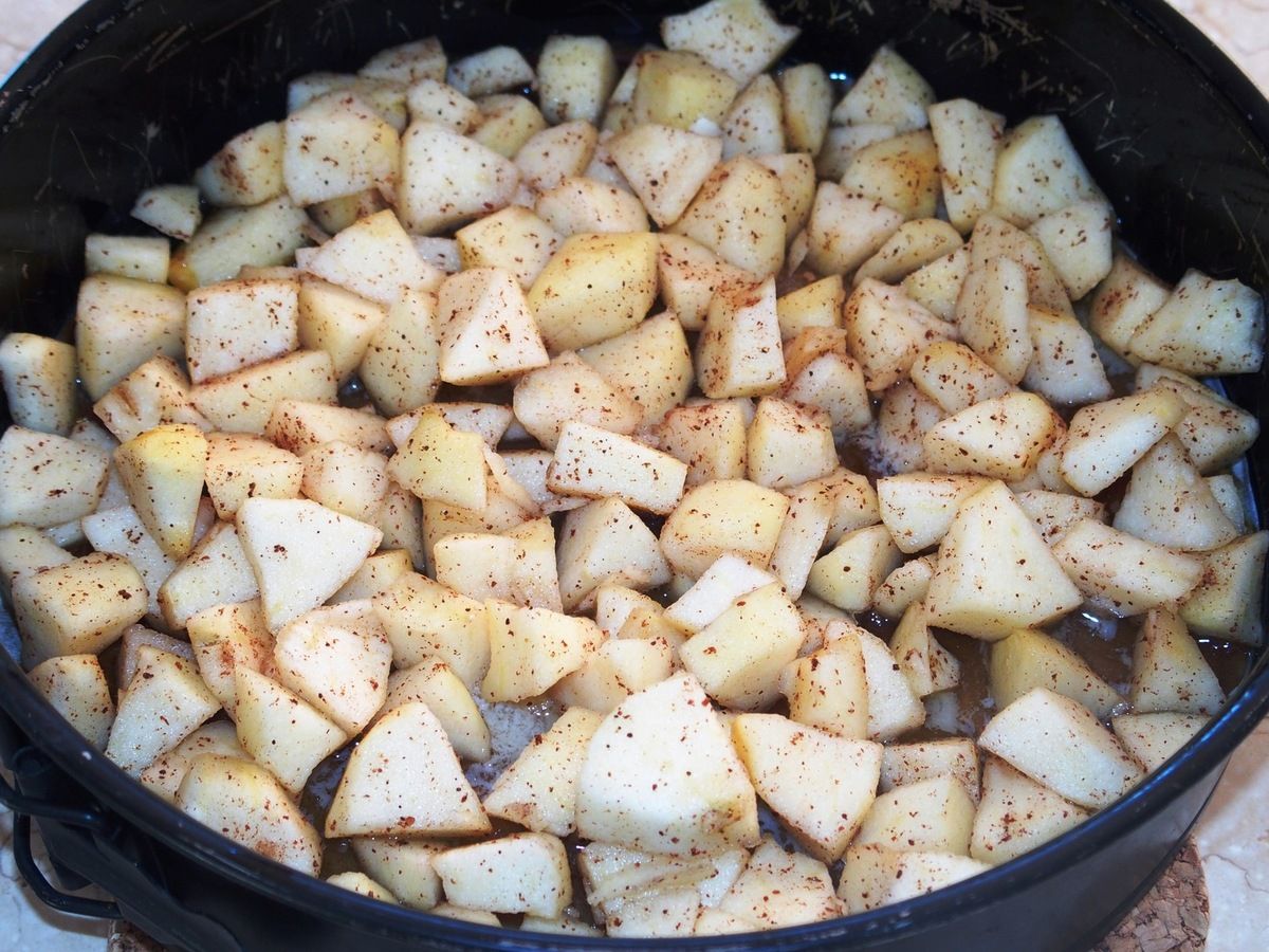 3) Peler les pommes, retirer le centre et les couper en dés. Les mélanger dans un récipient avec la cannelle et le jus de citron. Répartir les pommes dans le fond du moule sur le caramel.