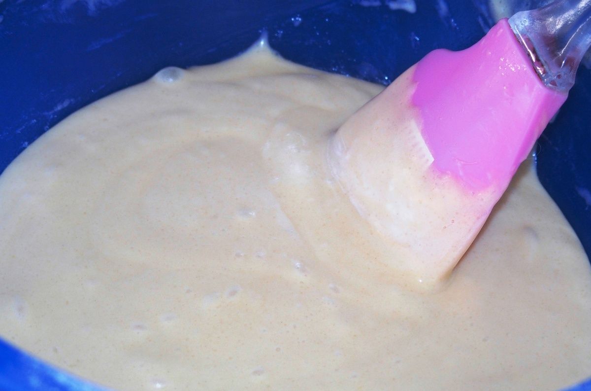 4) Préparer le Quatre-quarts: dans un grand récipient, mélanger au fouet les oeufs entiers et 200g de sucre jusqu'à ce que le mélange blanchisse. Mélanger la farine avec la poudre à lever et la pincée de sel et ajouter. Mélanger à la spatule soigneusement. Ajouter ensuite le beurre fondu en filet en mélangeant toujours soigneusement.