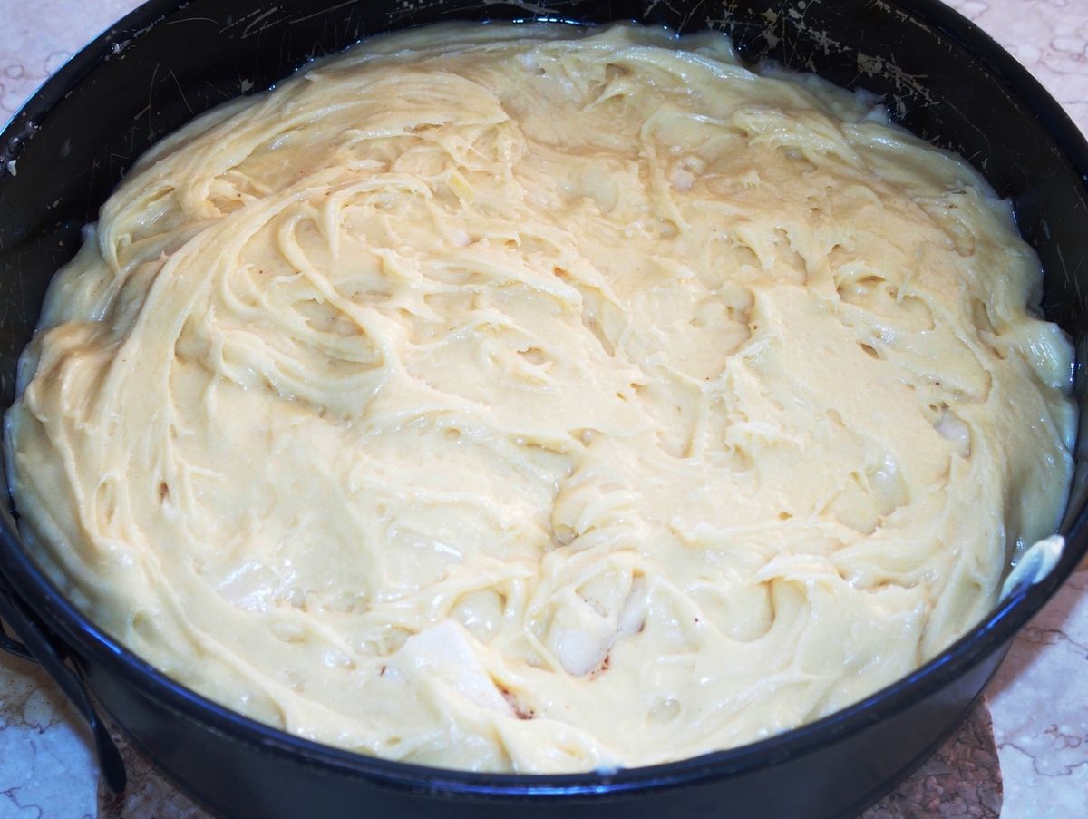 5) Mettre la liaison du Quatre-quarts sur les pommes. La pâte ne vous semble pas assez liquide et difficile à répartir? C'est normal. Utiliser vos petits doigts pour finir de la répartir uniformément sur les pommes. Enfourner pour 35 à 40 minutes dans le bas du four préchauffé à 180°C. Vérifier la cuisson en plantant la lame d'un petit couteau qui doit ressortir propre (s'il y a du caramel, c'est normal, mais la pâte doit être cuite). Sortir le moule du four. Décoller les bords avec un couteau.