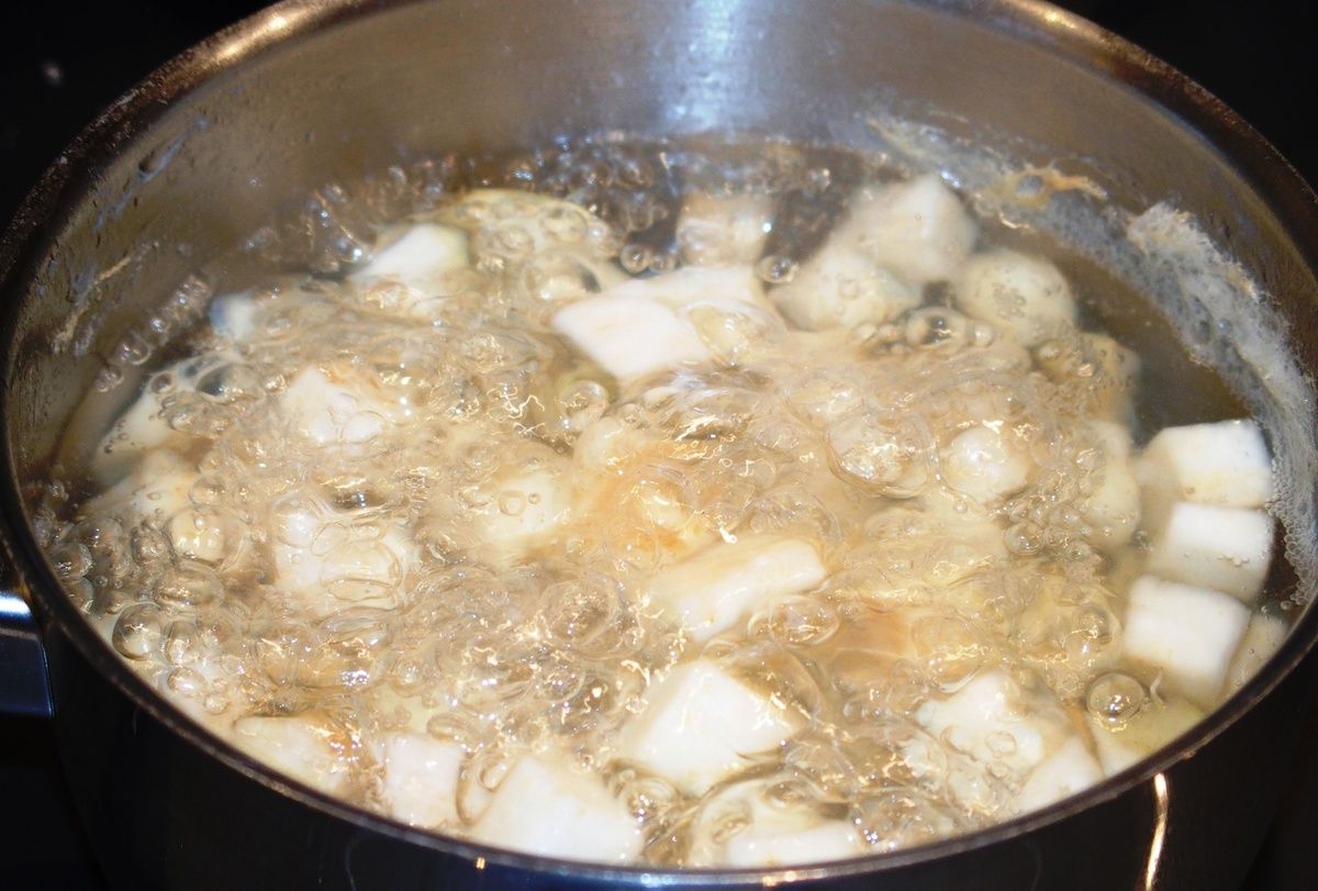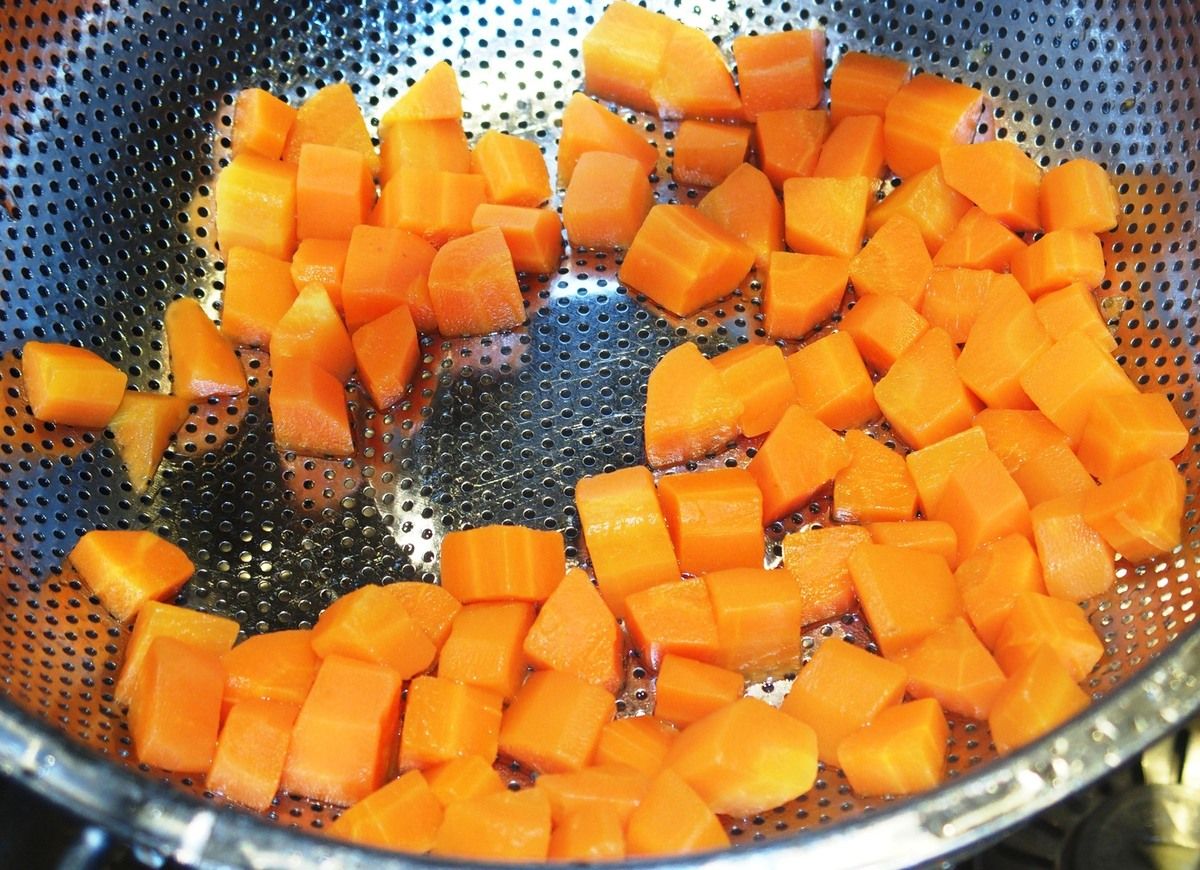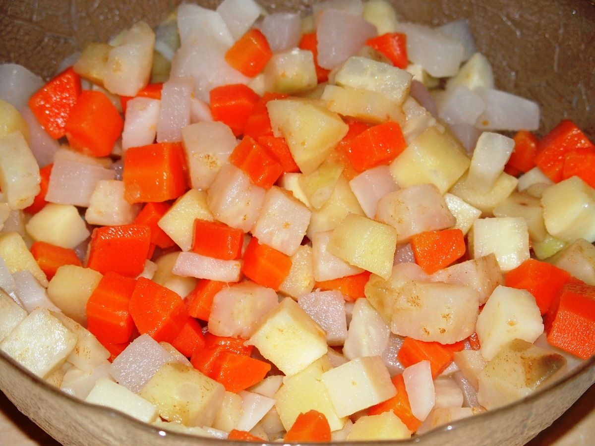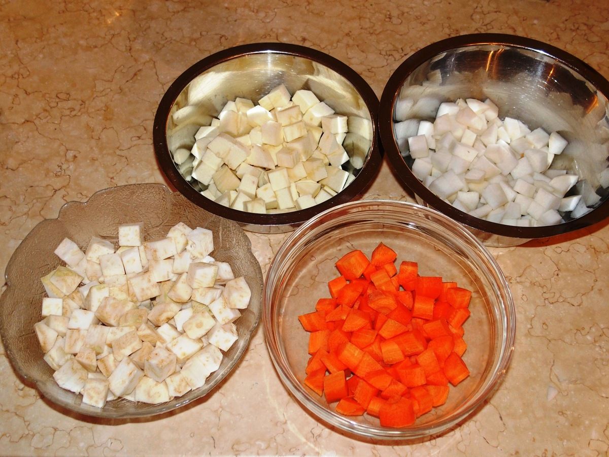 1) Eplucher les légumes et les couper en petits dés. Les réserver séparément dans des récipients.