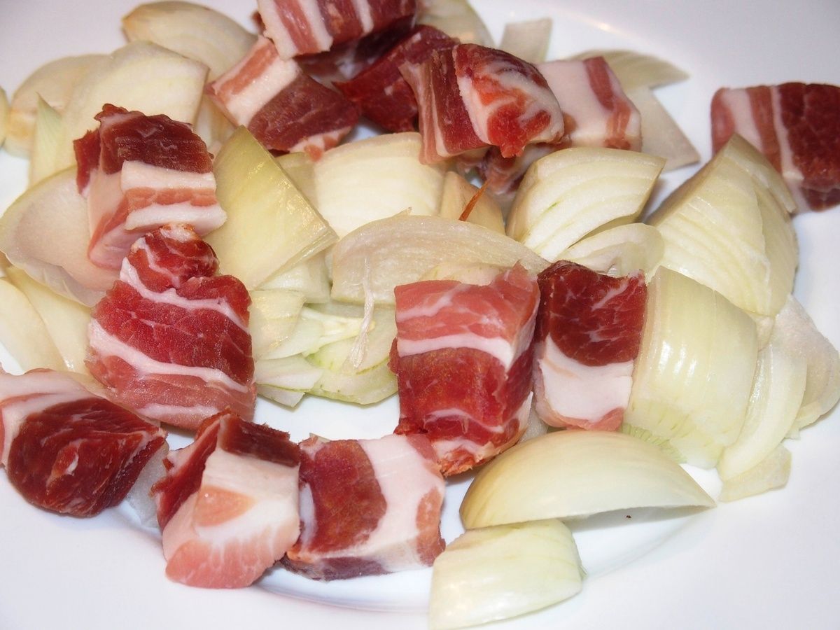 2) Peler et couper grossièrement les oignons. Couper le lard en dés moyens. Réserver dans un récipient.