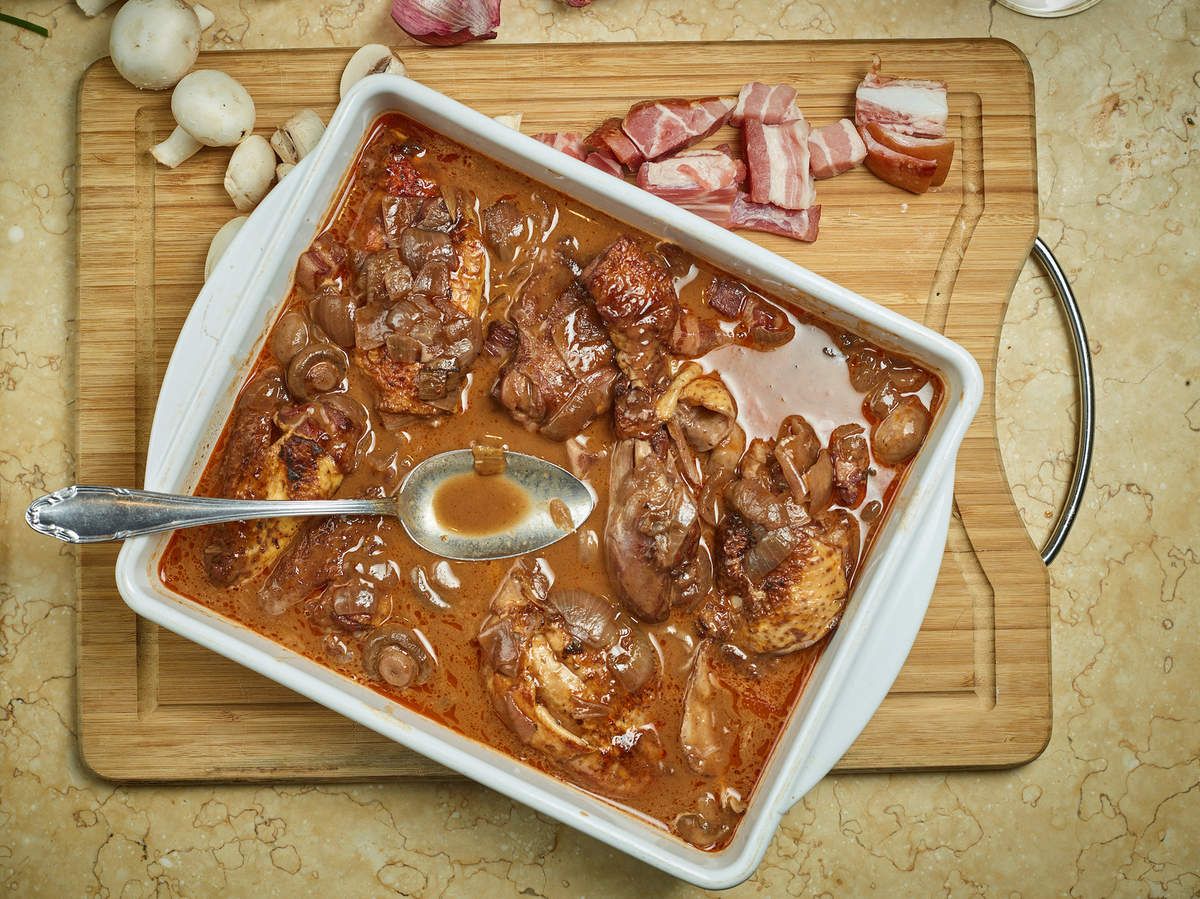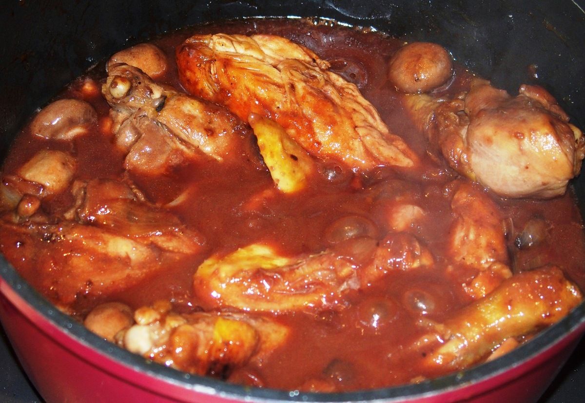 Ouh la la! Vous n'imaginez même pas comme c'est bon! Un bon poulet coupé en morceaux et cuit en cocotte dans du vin rouge, avec des champignons frais, du lard fumé, des oignons... Ce qui est démoniaque dans cette recette, et je le dis en toute sincérité parce que mon homme l'a trouvée exceptionnelle, c'est la sauce. Le jus quoi. D'une gourmandise, d'une finesse... le rêve. Et le tout réalisé simplement et sans technicité particulière. Après avoir piqué l'idée dans un livre, je l'ai faite à ma sauce.
