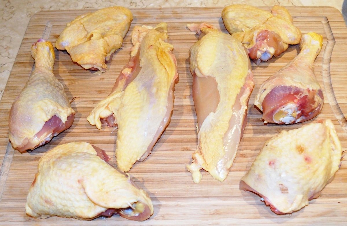 1) Couper le poulet en 8 morceaux si ce n'est pas déjà fait. Les cuisses coupées en 2, les ailes et les filets. Comme ça: