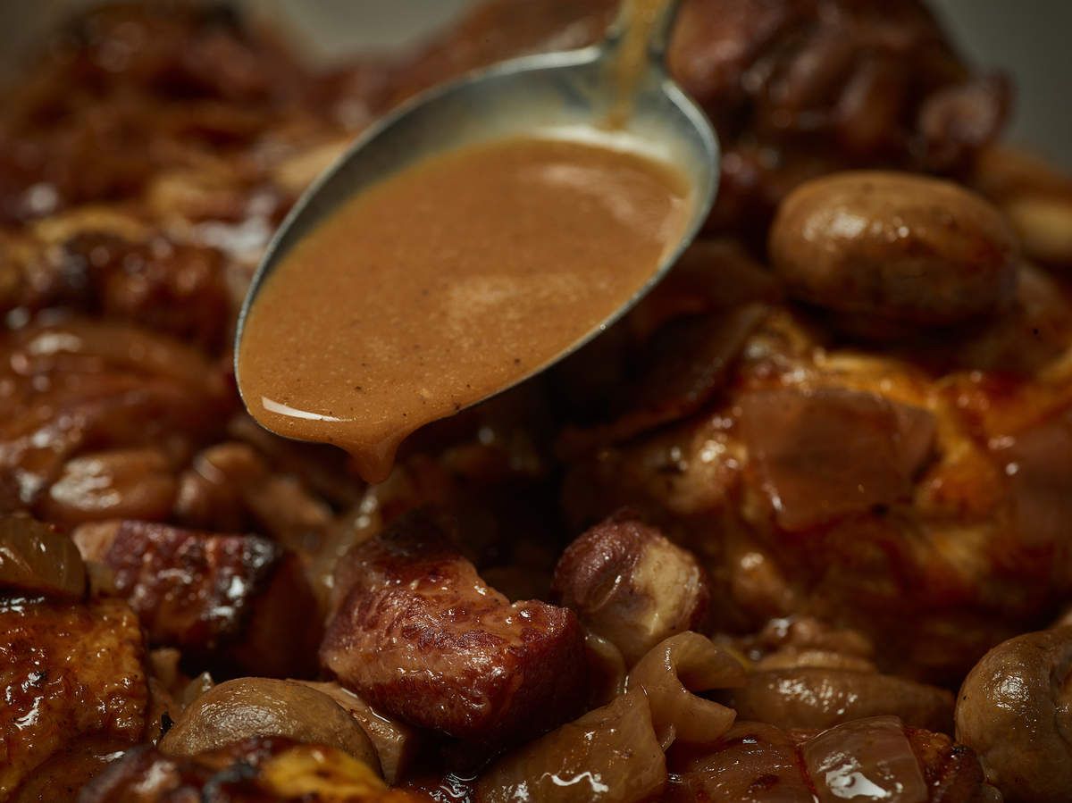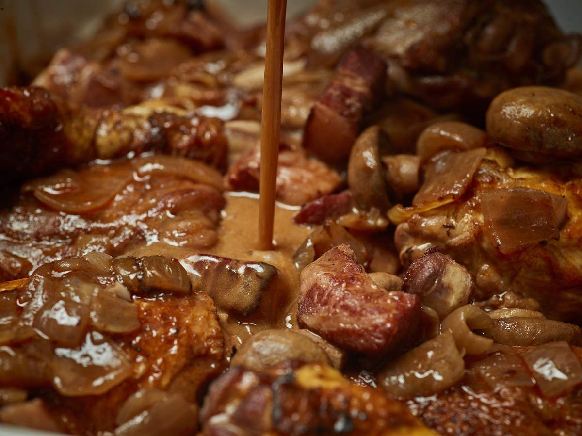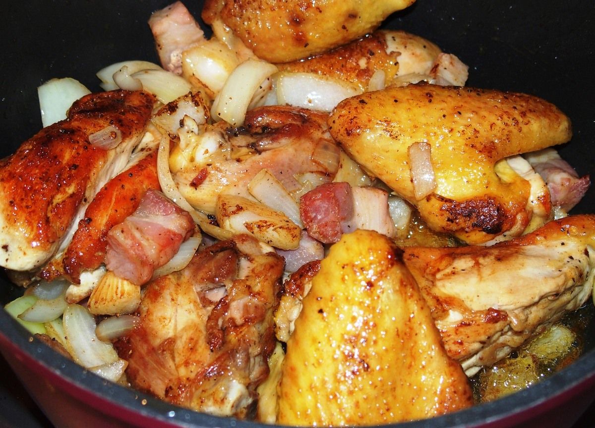 5) Mettre le poulet dans un plat et jeter une partie du gras de la cocotte (en laisser juste un fond). Remettre le poulet SAUF LES FILETS (ne faites pas comme sur la photo, ils n'ont pas besoin d'autant de cuisson, sinon ils sont trop secs). Ajouter les oignons et les morceaux de lard fumé. Faire revenir 10 minutes en mélangeant, toujours sur feu moyen-vif. Puis ajouter les champignons et l'ail. Faire revenir encore 2 minutes.