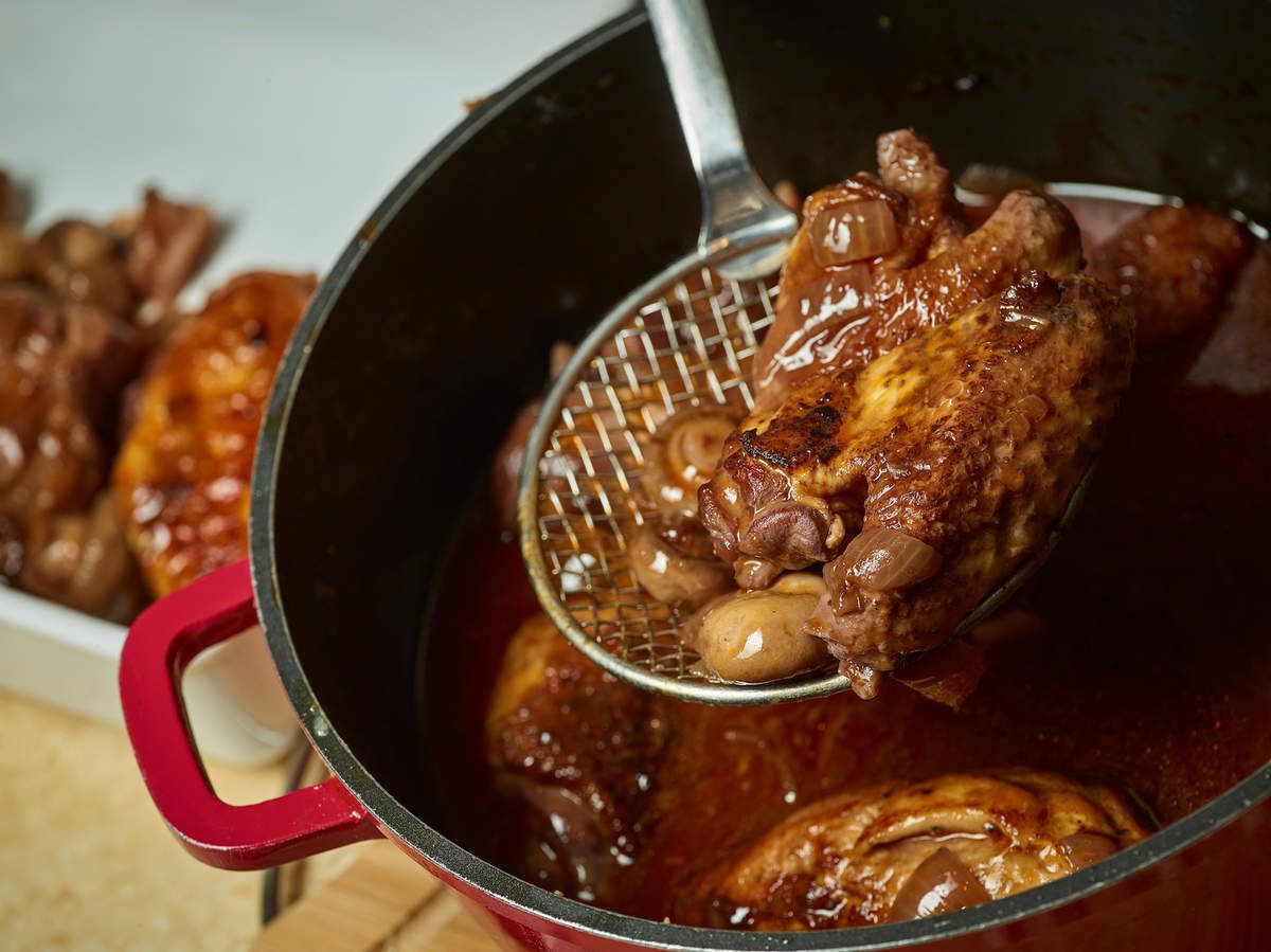 Sinon, découpez-le vous-même en tirant d'abord sur les cuisses, puis sur les ailes et levez les deux filets. Et prélevez les sot-l'y-laisse. Avec la carcasse, vous pouvez faire un super jus de volaille en la coupant en morceaux et en la faisant revenir avec ail, oignon, céleri branche et carotte, sel et poivre. Recouvrez d'eau et laissez mijoter 2 heures. Et congelez-le, ce bouillon, vous en aurez bien l'utilité un jour... Encore mieux: à utiliser pour cette recette en préparant le bouillon à l'avance!